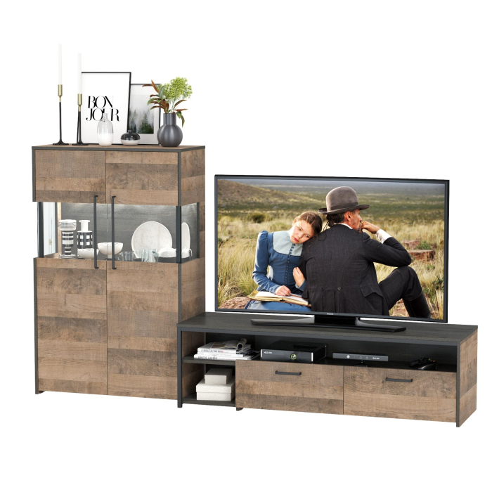 Брутальный декор и контрастная кромка, как и лицевая фурнитура придаёт мебели индустриальную эстетику. Комплектация состоит из тумбы под ТВ Трувор 13.70 и комода с витриной Трувор 13.306. Тумба Трувор 13.70 оснащена широкой нишей сверху и 2 выдвижными ящиками и небольшой нишей снизу. Столешница тумбы имеет по центру кабель-канал, что значительно упрощает подключение техники и проблемы с проводами. Направляющие выдвижных ящиков скрытого монтажа оснащены доводчиками, что обеспечивают повышенный комфорт и надёжность. На нижних кромках опор тумбы предусмотрены пластиковые подпятники для защиты поверхности пола от механических повреждений. Тумба под ТВ Трувор 13.70 имеет универсальную сборку, что позволяет расположить ящики как справа, так и слева. Металлические элементы делают эту мебель надёжной, аутентичной и функциональной. За распашными дверками комода со стеклянными вставками расположены 3 полки. Центральная часть комода имеет витрину с подсветкой. Светодиодная подсветка в витрине со стеклом — эффектно подчёркивает аксессуары. На нижних кромках опор комода предусмотрены пластиковые подпятники для защиты поверхности пола от механических повреждений. Четырёхшарнирные петли дверей оснащены доводчиками, что обеспечивают повышенный комфорт и надёжность. Выполнена мебель из ламинированной ДСП 16 мм и металлических элементов, торцы окромлены ПХВ плёнкой 0,4 мм. В производстве мебели использована современная фурнитура, отличающаяся высокой надёжностью и долговечностью. Поставляется в разобранном виде в надёжной упаковке, с комплектом сборочной фурнитуры и инструкцией по сборке.