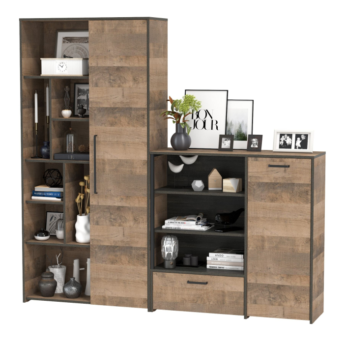 Брутальный декор и контрастная кромка, как и лицевая фурнитура придаёт мебели индустриальную эстетику. Комплектация состоит из шкафа-стеллажа Трувор 13.206 и комода с дверкой Трувор 13.307.01. Вместительный комод оснащен 2 полками за распашной дверкой с одной стороны и 3 открытыми нишами и выдвижным ящиком снизу с другой. Направляющие выдвижных ящиков скрытого монтажа и четырёхшарнирные петли дверки оснащены доводчиками, что обеспечивают повышенный комфорт и надёжность. Комод Трувор 13.307.01 имеет универсальную сборку, что позволяет расположить дверку как справа, так и слева. На нижних кромках опор комода предусмотрены пластиковые подпятники для защиты поверхности пола от механических повреждений. Металлические элементы делают эту мебель надёжной, аутентичной и функциональной. Шкаф-стеллаж состоит из двух отделений - с одной стороны с дверкой, с другой с открытыми полками. За распашной дверкой расположены 4 полки, дверь оборудована широкой ручкой. Открытое отделение с открытыми имеет сверху и снизу большие ниши и по центру 6 ниш поменьше. Шкаф-стеллаж Трувор 13.206 имеет универсальную сборку, сторону открывания двери и ее расположение Вы определяете при сборке. Четырёхшарнирные петли двери оснащены доводчиками, что обеспечивают повышенный комфорт и надёжность. На нижних кромках шкафа предусмотрены пластиковые подпятники для защиты поверхности пола от механических повреждений. Выполнена мебель из ламинированной ДСП 16 мм и металлических элементов, торцы окромлены ПХВ плёнкой 0,4 мм. В производстве мебели использована современная фурнитура, отличающаяся высокой надёжностью и долговечностью. Поставляется в разобранном виде в надёжной упаковке, с комплектом сборочной фурнитуры и инструкцией по сборке.