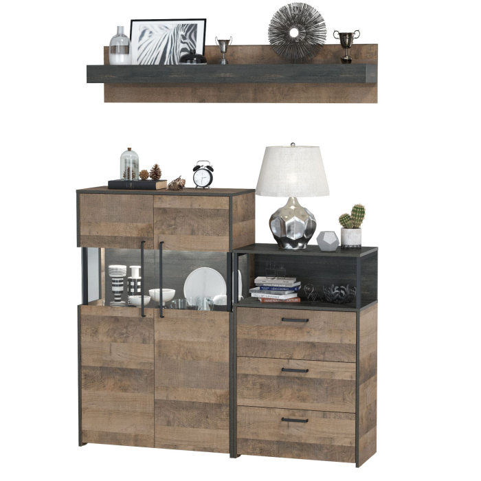 Брутальный декор и контрастная кромка, как и лицевая фурнитура придаёт мебели индустриальную эстетику. Комплектация состоит из полки навесной Трувор 15.60, комода с ящиками Трувор 13.307.02 и комода с витриной Трувор 13.306. Аккуратный комод оснащен 3 выдвижными ящиками и открытой нишей сверху. Направляющие выдвижных ящиков скрытого монтажа оснащены доводчиками, что обеспечивают повышенный комфорт и надёжность. На нижних кромках опор комода предусмотрены пластиковые подпятники для защиты поверхности пола от механических повреждений. Металлические элементы делают эту мебель надёжной, аутентичной и функциональной. За распашными дверками комода со стеклянными вставками расположены 3 полки. Центральная часть комода имеет витрину с подсветкой. Светодиодная подсветка в витрине со стеклом — эффектно подчёркивает аксессуары. На нижних кромках опор комода предусмотрены пластиковые подпятники для защиты поверхности пола от механических повреждений. Четырёхшарнирные петли дверей оснащены доводчиками, что обеспечивают повышенный комфорт и надёжность. Над комодом располагается классическая навесная открытая полка с задней панелью. Полка располагается по центру панели и оборудована бортиком. Полку Трувор 15.60 можно использовать как книжную, а также для размещения элементов декора, поделок и фоторгафий. Полка имеет с обратной стороны панели скрытые крепленния. Максимальная нагрузка на полку составляет 3 кг. Выполнена мебель из ламинированной ДСП 16 мм и металлических элементов, торцы окромлены ПХВ плёнкой 0,4 мм. В производстве мебели использована современная фурнитура, отличающаяся высокой надёжностью и долговечностью. Поставляется в разобранном виде в надёжной упаковке, с комплектом сборочной фурнитуры и инструкцией по сборке.