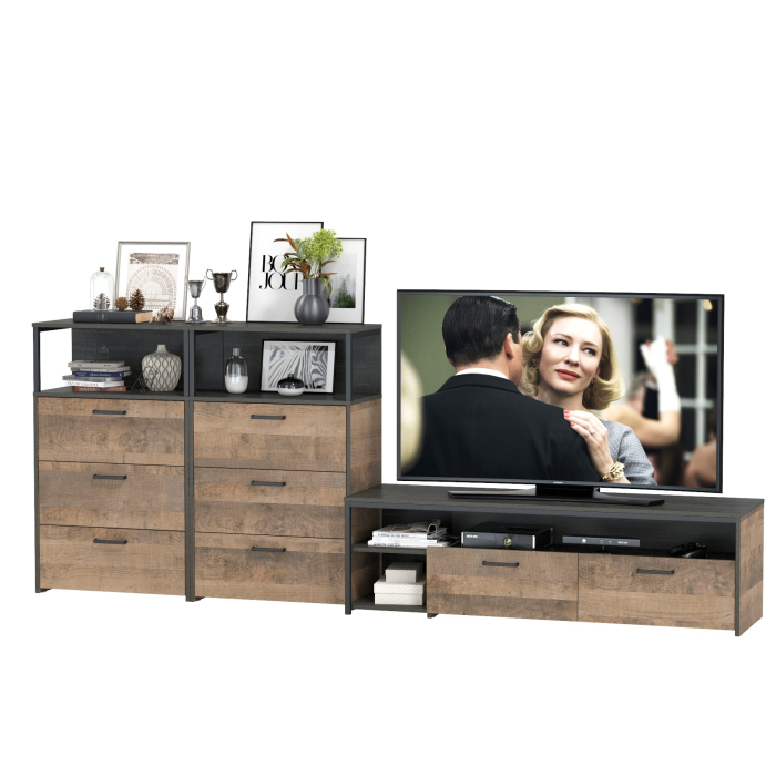 Брутальный декор и контрастная кромка, как и лицевая фурнитура придаёт мебели индустриальную эстетику. Комплектация состоит из тумбы под ТВ Трувор 13.70 и двух комодов с ящиками Трувор 13.307.02. Тумба Трувор 13.70 оснащена широкой нишей сверху и 2 выдвижными ящиками и небольшой нишей снизу. Столешница тумбы имеет по центру кабель-канал, что значительно упрощает подключение техники и проблемы с проводами. Направляющие выдвижных ящиков скрытого монтажа оснащены доводчиками, что обеспечивают повышенный комфорт и надёжность. На нижних кромках опор тумбы предусмотрены пластиковые подпятники для защиты поверхности пола от механических повреждений. Тумба под ТВ Трувор 13.70 имеет универсальную сборку, что позволяет расположить ящики как справа, так и слева. Металлические элементы делают эту мебель надёжной, аутентичной и функциональной. Аккуратный комод оснащен 3 выдвижными ящиками и открытой нишей сверху. В комп. 2 ед.. Направляющие выдвижных ящиков скрытого монтажа оснащены доводчиками, что обеспечивают повышенный комфорт и надёжность. На нижних кромках опор комода предусмотрены пластиковые подпятники для защиты поверхности пола от механических повреждений. Металлические элементы делают эту мебель надёжной, аутентичной и функциональной. Выполнена мебель из ламинированной ДСП 16 мм и металлических элементов, торцы окромлены ПХВ плёнкой 0,4 мм. В производстве мебели использована современная фурнитура, отличающаяся высокой надёжностью и долговечностью. Поставляется в разобранном виде в надёжной упаковке, с комплектом сборочной фурнитуры и инструкцией по сборке.