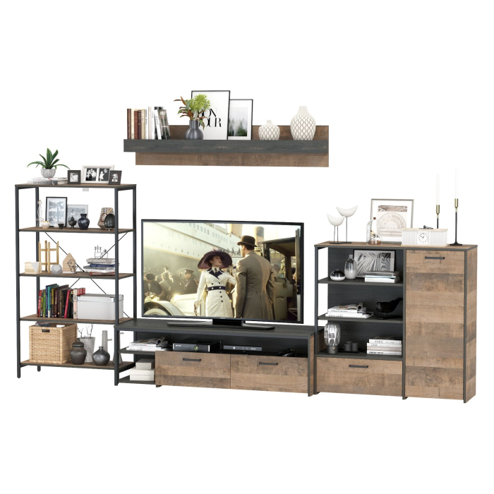 Брутальный декор и контрастная кромка, как и лицевая фурнитура придаёт мебели индустриальную эстетику. Комплектация состоит из тумбы под ТВ Трувор 13.70, полки навесной Трувор 15.60, стеллажа Трувор 13.151.01 и комода с дверкой Трувор 13.307.01. Тумба Трувор 13.70 оснащена широкой нишей сверху и 2 выдвижными ящиками и небольшой нишей снизу. Столешница тумбы имеет по центру кабель-канал, что значительно упрощает подключение техники и проблемы с проводами. Тумба под ТВ Трувор 13.70 имеет универсальную сборку, что позволяет расположить ящики как справа, так и слева. Классическая навесная открытая полка с задней панелью расположена над тумбой. Полка располагается по центру панели и оборудована бортиком. Полку Трувор 15.60 можно использовать как книжную, а также для размещения элементов декора, поделок и фоторгафий. Полка имеет с обратной стороны панели скрытые крепленния. Максимальная нагрузка на полку составляет 3 кг. Вместительный комод оснащен 2 полками за распашной дверкой с одной стороны и 3 открытыми нишами и выдвижным ящиком снизу с другой. Комод Трувор 13.307.01 имеет универсальную сборку, что позволяет расположить дверку как справа, так и слева. Направляющие выдвижных ящиков скрытого монтажа и четырёхшарнирные петли дверки оснащены доводчиками, что обеспечивают повышенный комфорт и надёжность. На нижних кромках опор предусмотрены пластиковые подпятники для защиты поверхности пола от механических повреждений. Металлические элементы делают эту мебель надёжной, аутентичной и функциональной. Устойчивый стеллаж Трувор 13.151.01 с 4 полками с возможность доступа с любой стороны. Металлические стойки с регулируемыми опорами делают этот стеллаж надёжным, аутентичнымй и функциональным. Использование крестовых металлических стяжек вместо задней стенки делает конструкцию лёгкой, воздушной и устойчивой к боковым нагрузкам. Выполнена мебель из ламинированной ДСП 16 мм и металлических элементов, торцы окромлены ПХВ плёнкой 0,4 мм. В производстве мебели использована современная фурнитура, отличающаяся высокой надёжностью и долговечностью. Поставляется в разобранном виде в надёжной упаковке, с комплектом сборочной фурнитуры и инструкцией по сборке.