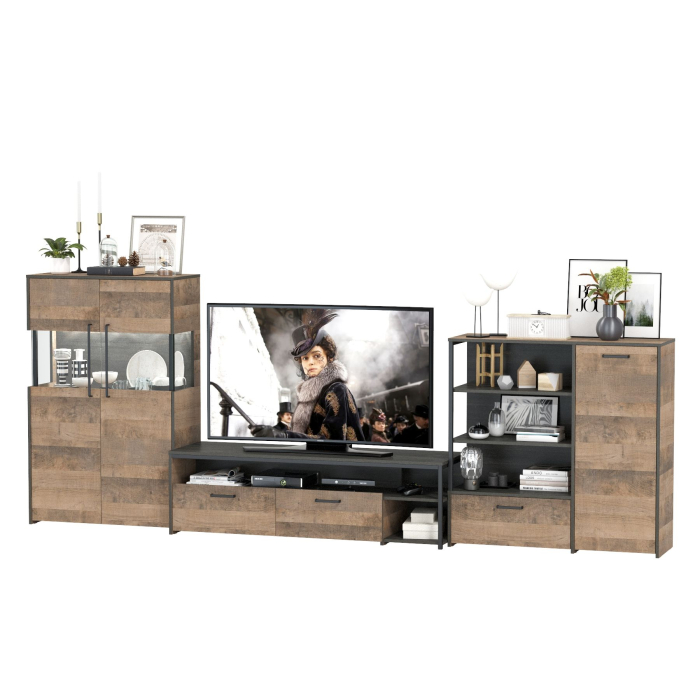 Брутальный декор и контрастная кромка, как и лицевая фурнитура придаёт мебели индустриальную эстетику. Комплектация состоит из тумбы под ТВ Трувор 13.70, комода с дверкой Трувор 13.307.01 и комода с витриной Трувор 13.306. Тумба Трувор 13.70 оснащена широкой нишей сверху и 2 выдвижными ящиками и небольшой нишей снизу. Столешница тумбы имеет по центру кабель-канал, что значительно упрощает подключение техники и проблемы с проводами. Тумба под ТВ Трувор 13.70 имеет универсальную сборку, что позволяет расположить ящики как справа, так и слева. Вместительный комод оснащен 2 полками за распашной дверкой с одной стороны и 3 открытыми нишами и выдвижным ящиком снизу с другой. Комод Трувор 13.307.01 имеет универсальную сборку, что позволяет расположить дверку как справа, так и слева. Направляющие выдвижных ящиков скрытого монтажа и четырёхшарнирные петли дверки оснащены доводчиками, что обеспечивают повышенный комфорт и надёжность. Металлические элементы делают эту мебель надёжной, аутентичной и функциональной. За распашными дверками комода со стеклянными вставками расположены 3 полки. Центральная часть комода имеет витрину с подсветкой. Светодиодная подсветка в витрине со стеклом — эффектно подчёркивает аксессуары. Четырёхшарнирные петли дверей оснащены доводчиками, что обеспечивают повышенный комфорт и надёжность. На нижних кромках опор предусмотрены пластиковые подпятники для защиты поверхности пола от механических повреждений. Выполнена мебель из ламинированной ДСП 16 мм и металлических элементов, торцы окромлены ПХВ плёнкой 0,4 мм. В производстве мебели использована современная фурнитура, отличающаяся высокой надёжностью и долговечностью. Поставляется в разобранном виде в надёжной упаковке, с комплектом сборочной фурнитуры и инструкцией по сборке.
