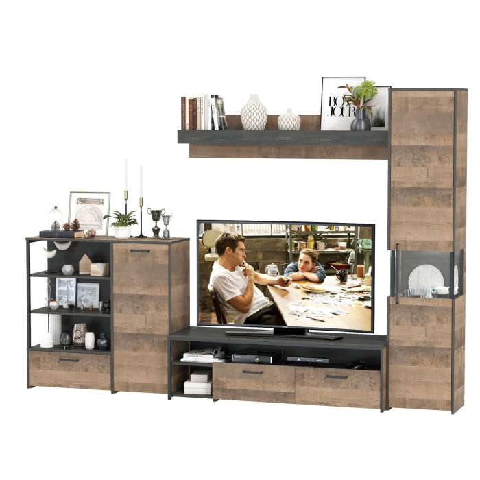 Брутальный декор и контрастная кромка, как и лицевая фурнитура придаёт мебели индустриальную эстетику. Комплектация состоит из тумбы под ТВ Трувор 13.70, полки навесной Трувор 15.60, комода с дверкой Трувор 13.307.01 и шкафа-пенала с витриной Трувор 13.205. Тумба Трувор 13.70 оснащена широкой нишей сверху и 2 выдвижными ящиками и небольшой нишей снизу. Столешница тумбы имеет по центру кабель-канал, что значительно упрощает подключение техники и проблемы с проводами. Тумба под ТВ Трувор 13.70 имеет универсальную сборку, что позволяет расположить ящики как справа, так и слева. Классическая навесная открытая полка с задней панелью расположена над тумбой. Полка располагается по центру панели и оборудована бортиком. Полку Трувор 15.60 можно использовать как книжную, а также для размещения элементов декора, поделок и фоторгафий. Полка имеет с обратной стороны панели скрытые крепленния. Максимальная нагрузка на полку составляет 3 кг. Вместительный комод оснащен 2 полками за распашной дверкой с одной стороны и 3 открытыми нишами и выдвижным ящиком снизу с другой. Комод Трувор 13.307.01 имеет универсальную сборку, что позволяет расположить дверку как справа, так и слева. Шкаф-пенал Трувор 13.205 за распашной дверкой со стеклянной вставкой расположены 5 полочек, 2 из которых съемные. Пенал имеет витрину с подсветкой. Светодиодная подсветка в витрине со стеклом — эффектно подчёркивает аксессуары. Шкаф-пенал с витриной имеет универсальную сборку, сторону открывания двери Вы определяете при сборке. Четырёхшарнирные петли двери оснащены доводчиками, что обеспечивают повышенный комфорт и надёжность. Направляющие выдвижных ящиков скрытого монтажа и четырёхшарнирные петли дверки оснащены доводчиками, что обеспечивают повышенный комфорт и надёжность. На нижних кромках опор предусмотрены пластиковые подпятники для защиты поверхности пола от механических повреждений. Металлические элементы делают эту мебель надёжной, аутентичной и функциональной. Выполнена мебель из ламинированной ДСП 16 мм и металлических элементов, торцы окромлены ПХВ плёнкой 0,4 мм. В производстве мебели использована современная фурнитура, отличающаяся высокой надёжностью и долговечностью. Поставляется в разобранном виде в надёжной упаковке, с комплектом сборочной фурнитуры и инструкцией по сборке.