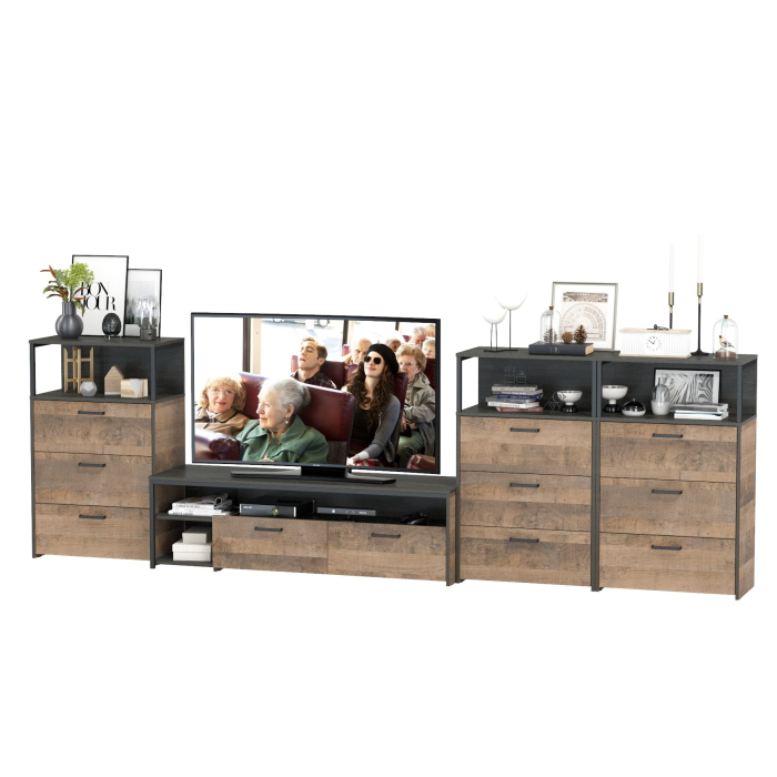 Брутальный декор и контрастная кромка, как и лицевая фурнитура придаёт мебели индустриальную эстетику. Комплектация состоит из тумбы под ТВ Трувор 13.70 и трех комодов с ящиками Трувор 13.307.02. Тумба Трувор 13.70 оснащена широкой нишей сверху и 2 выдвижными ящиками и небольшой нишей снизу. Столешница тумбы имеет по центру кабель-канал, что значительно упрощает подключение техники и проблемы с проводами. Тумба под ТВ Трувор 13.70 имеет универсальную сборку, что позволяет расположить ящики как справа, так и слева. Аккуратный комод оснащен 3 выдвижными ящиками и открытой нишей сверху. В комп. 3 ед.. Направляющие выдвижных ящиков скрытого монтажа оснащены доводчиками, что обеспечивают повышенный комфорт и надёжность. На нижних кромках опор предусмотрены пластиковые подпятники для защиты поверхности пола от механических повреждений. Металлические элементы делают эту мебель надёжной, аутентичной и функциональной. Выполнена мебель из ламинированной ДСП 16 мм и металлических элементов, торцы окромлены ПХВ плёнкой 0,4 мм. В производстве мебели использована современная фурнитура, отличающаяся высокой надёжностью и долговечностью. Поставляется в разобранном виде в надёжной упаковке, с комплектом сборочной фурнитуры и инструкцией по сборке.