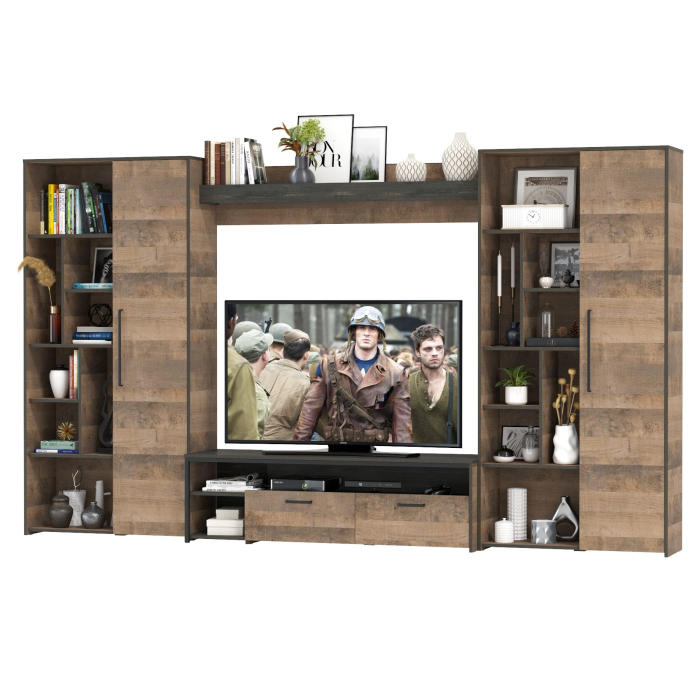 Брутальный декор и контрастная кромка, как и лицевая фурнитура придаёт мебели индустриальную эстетику. Комплектация состоит из тумбы под ТВ Трувор 13.70, полки навесной Трувор 15.60 и двух шкафов-стеллажей Трувор 13.206. Тумба Трувор 13.70 оснащена широкой нишей сверху и 2 выдвижными ящиками и небольшой нишей снизу. Столешница тумбы имеет по центру кабель-канал, что значительно упрощает подключение техники и проблемы с проводами. Тумба под ТВ Трувор 13.70 имеет универсальную сборку, что позволяет расположить ящики как справа, так и слева. Классическая навесная открытая полка с задней панелью расположена над тумбой. Полка располагается по центру панели и оборудована бортиком. Полку Трувор 15.60 можно использовать как книжную, а также для размещения элементов декора, поделок и фоторгафий. Полка имеет с обратной стороны панели скрытые крепленния. Максимальная нагрузка на полку составляет 3 кг. Шкаф-стеллаж состоит из двух отделений - с одной стороны с дверкой, с другой с открытыми полками. В комп. 2 шкафа-стеллажа. За распашной дверкой расположены 4 полки, дверь оборудована широкой ручкой. Открытое отделение с открытыми имеет сверху и снизу большие ниши и по центру 6 ниш поменьше. Шкаф-стеллаж Трувор 13.206 имеет универсальную сборку, сторону открывания двери и ее расположение Вы определяете при сборке. Четырёхшарнирные петли двери оснащены доводчиками, что обеспечивают повышенный комфорт и надёжность. Направляющие выдвижных ящиков скрытого монтажа оснащены доводчиками, что обеспечивают повышенный комфорт и надёжность. На нижних кромках опор предусмотрены пластиковые подпятники для защиты поверхности пола от механических повреждений. Металлические элементы делают эту мебель надёжной, аутентичной и функциональной. Выполнена мебель из ламинированной ДСП 16 мм и металлических элементов, торцы окромлены ПХВ плёнкой 0,4 мм. В производстве мебели использована современная фурнитура, отличающаяся высокой надёжностью и долговечностью. Поставляется в разобранном виде в надёжной упаковке, с комплектом сборочной фурнитуры и инструкцией по сборке.