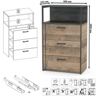 Брутальный декор и контрастная кромка, как и лицевая фурнитура придаёт мебели индустриальную эстетику. Комплектация состоит из тумбы под ТВ Трувор 13.70, двух комодов с ящиками Трувор 13.307.02 и шкафа-пенала с витриной Трувор 13.205. Тумба Трувор 13.70 оснащена широкой нишей сверху и 2 выдвижными ящиками и небольшой нишей снизу. Столешница тумбы имеет по центру кабель-канал, что значительно упрощает подключение техники и проблемы с проводами. Тумба под ТВ Трувор 13.70 имеет универсальную сборку, что позволяет расположить ящики как справа, так и слева. Аккуратный комод оснащен 3 выдвижными ящиками и открытой нишей сверху. В комп. 2 ед.. Шкаф-пенал Трувор 13.205 за распашной дверкой со стеклянной вставкой расположены 5 полочек, 2 из которых съемные. Пенал имеет витрину с подсветкой. Светодиодная подсветка в витрине со стеклом — эффектно подчёркивает аксессуары. Шкаф-пенал с витриной имеет универсальную сборку, сторону открывания двери Вы определяете при сборке. Четырёхшарнирные петли двери оснащены доводчиками, что обеспечивают повышенный комфорт и надёжность. Направляющие выдвижных ящиков скрытого монтажа оснащены доводчиками, что обеспечивают повышенный комфорт и надёжность. На нижних кромках опор предусмотрены пластиковые подпятники для защиты поверхности пола от механических повреждений. Металлические элементы делают эту мебель надёжной, аутентичной и функциональной. Выполнена мебель из ламинированной ДСП 16 мм и металлических элементов, торцы окромлены ПХВ плёнкой 0,4 мм. В производстве мебели использована современная фурнитура, отличающаяся высокой надёжностью и долговечностью. Поставляется в разобранном виде в надёжной упаковке, с комплектом сборочной фурнитуры и инструкцией по сборке.