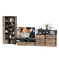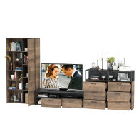 Брутальный декор и контрастная кромка, как и лицевая фурнитура придаёт мебели индустриальную эстетику. Комплектация состоит из тумбы под ТВ Трувор 13.70, двух комодов с ящиками Трувор 13.307.02 и шкафа-стеллажа Трувор 13.206. Тумба Трувор 13.70 оснащена широкой нишей сверху и 2 выдвижными ящиками и небольшой нишей снизу. Столешница тумбы имеет по центру кабель-канал, что значительно упрощает подключение техники и проблемы с проводами. Тумба под ТВ Трувор 13.70 имеет универсальную сборку, что позволяет расположить ящики как справа, так и слева. Аккуратный комод оснащен 3 выдвижными ящиками и открытой нишей сверху. В комп. 2 ед.. Шкаф-стеллаж состоит из двух отделений - с одной стороны с дверкой, с другой с открытыми полками. За распашной дверкой расположены 4 полки, дверь оборудована широкой ручкой. Открытое отделение с открытыми имеет сверху и снизу большие ниши и по центру 6 ниш поменьше. Шкаф-стеллаж Трувор 13.206 имеет универсальную сборку, сторону открывания двери и ее расположение Вы определяете при сборке. Четырёхшарнирные петли двери оснащены доводчиками, что обеспечивают повышенный комфорт и надёжность. Направляющие выдвижных ящиков скрытого монтажа оснащены доводчиками, что обеспечивают повышенный комфорт и надёжность. На нижних кромках опор предусмотрены пластиковые подпятники для защиты поверхности пола от механических повреждений. Металлические элементы делают эту мебель надёжной, аутентичной и функциональной. Выполнена мебель из ламинированной ДСП 16 мм и металлических элементов, торцы окромлены ПХВ плёнкой 0,4 мм. В производстве мебели использована современная фурнитура, отличающаяся высокой надёжностью и долговечностью. Поставляется в разобранном виде в надёжной упаковке, с комплектом сборочной фурнитуры и инструкцией по сборке.