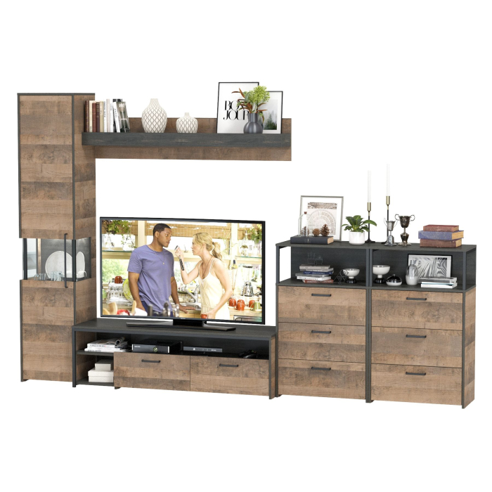 Брутальный декор и контрастная кромка, как и лицевая фурнитура придаёт мебели индустриальную эстетику. Комплектация состоит из тумбы под ТВ Трувор 13.70, полки навесной Трувор 15.60, двух комодов с ящиками Трувор 13.307.02 и шкафа-пенала с витриной Трувор 13.205. Тумба Трувор 13.70 оснащена широкой нишей сверху и 2 выдвижными ящиками и небольшой нишей снизу. Столешница тумбы имеет по центру кабель-канал, что значительно упрощает подключение техники и проблемы с проводами. Тумба под ТВ Трувор 13.70 имеет универсальную сборку, что позволяет расположить ящики как справа, так и слева. Классическая навесная открытая полка с задней панелью расположена над тумбой. Полка располагается по центру панели и оборудована бортиком. Полку Трувор 15.60 можно использовать как книжную, а также для размещения элементов декора, поделок и фоторгафий. Полка имеет с обратной стороны панели скрытые крепленния. Максимальная нагрузка на полку составляет 3 кг. Аккуратный комод оснащен 3 выдвижными ящиками и открытой нишей сверху. В комп. 2 ед.. Шкаф-пенал Трувор 13.205 за распашной дверкой со стеклянной вставкой расположены 5 полочек, 2 из которых съемные. Пенал имеет витрину с подсветкой. Светодиодная подсветка в витрине со стеклом — эффектно подчёркивает аксессуары. Шкаф-пенал с витриной имеет универсальную сборку, сторону открывания двери Вы определяете при сборке. Четырёхшарнирные петли двери оснащены доводчиками, что обеспечивают повышенный комфорт и надёжность. Направляющие выдвижных ящиков скрытого монтажа оснащены доводчиками, что обеспечивают повышенный комфорт и надёжность. На нижних кромках опор предусмотрены пластиковые подпятники для защиты поверхности пола от механических повреждений. Металлические элементы делают эту мебель надёжной, аутентичной и функциональной. Выполнена мебель из ламинированной ДСП 16 мм и металлических элементов, торцы окромлены ПХВ плёнкой 0,4 мм. В производстве мебели использована современная фурнитура, отличающаяся высокой надёжностью и долговечностью. Поставляется в разобранном виде в надёжной упаковке, с комплектом сборочной фурнитуры и инструкцией по сборке.