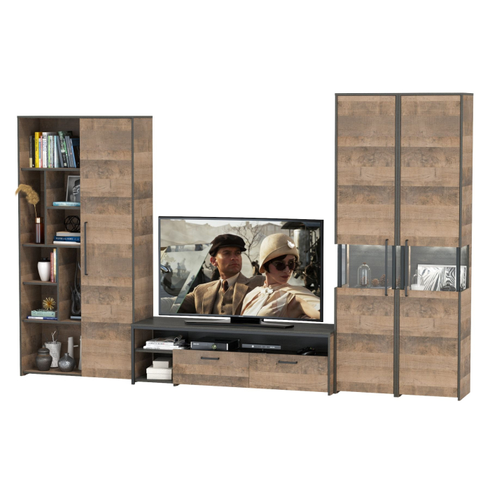 Брутальный декор и контрастная кромка, как и лицевая фурнитура придаёт мебели индустриальную эстетику. Комплектация состоит из тумбы под ТВ Трувор 13.70, двух шкафов-пеналов с витринами Трувор 13.205 и шкафа-стеллажа Трувор 13.206. Тумба Трувор 13.70 оснащена широкой нишей сверху и 2 выдвижными ящиками и небольшой нишей снизу. Столешница тумбы имеет по центру кабель-канал, что значительно упрощает подключение техники и проблемы с проводами. Тумба под ТВ Трувор 13.70 имеет универсальную сборку, что позволяет расположить ящики как справа, так и слева. Шкаф-пенал Трувор 13.205 за распашной дверкой со стеклянной вставкой расположены 5 полочек, 2 из которых съемные. В комп. 2 шкафа-пенала. Пенал имеет витрину с подсветкой. Светодиодная подсветка в витрине со стеклом — эффектно подчёркивает аксессуары. Шкаф-пенал с витриной имеет универсальную сборку, сторону открывания двери Вы определяете при сборке. Шкаф-стеллаж состоит из двух отделений - с одной стороны с дверкой, с другой с открытыми полками. За распашной дверкой расположены 4 полки, дверь оборудована широкой ручкой. Открытое отделение с открытыми имеет сверху и снизу большие ниши и по центру 6 ниш поменьше. Шкаф-стеллаж Трувор 13.206 имеет универсальную сборку, сторону открывания двери и ее расположение Вы определяете при сборке. Четырёхшарнирные петли двери оснащены доводчиками, что обеспечивают повышенный комфорт и надёжность. Направляющие выдвижных ящиков скрытого монтажа оснащены доводчиками, что обеспечивают повышенный комфорт и надёжность. На нижних кромках опор предусмотрены пластиковые подпятники для защиты поверхности пола от механических повреждений. Металлические элементы делают эту мебель надёжной, аутентичной и функциональной. Выполнена мебель из ламинированной ДСП 16 мм и металлических элементов, торцы окромлены ПХВ плёнкой 0,4 мм. В производстве мебели использована современная фурнитура, отличающаяся высокой надёжностью и долговечностью. Поставляется в разобранном виде в надёжной упаковке, с комплектом сборочной фурнитуры и инструкцией по сборке.