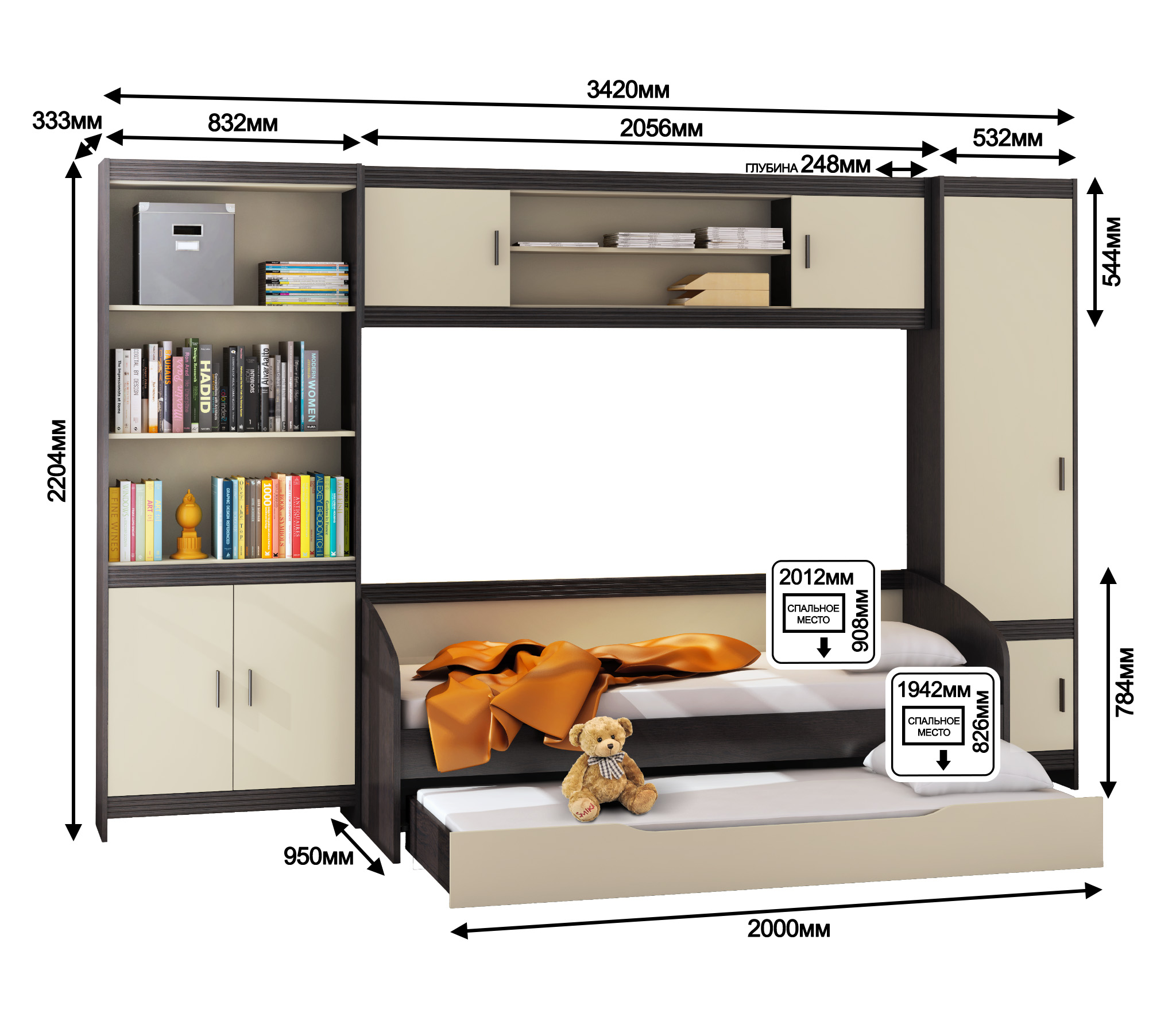 Брали кровать, стеллаж, пенал, стол и полку. Все очень красивого цвета, благородное сочетание. Кровать большая, массивная. Под пеналом и стеллажом есть пространство для уборки шваброй. Полка над столом с большими отделениями. Пенала для детской одежды вполне хватило. Ящик у кровати очень вместительный. Инструкция по сборке понятная. Всех гаек в достатке. Размеры все правильные, мы по ним комнату собирали.