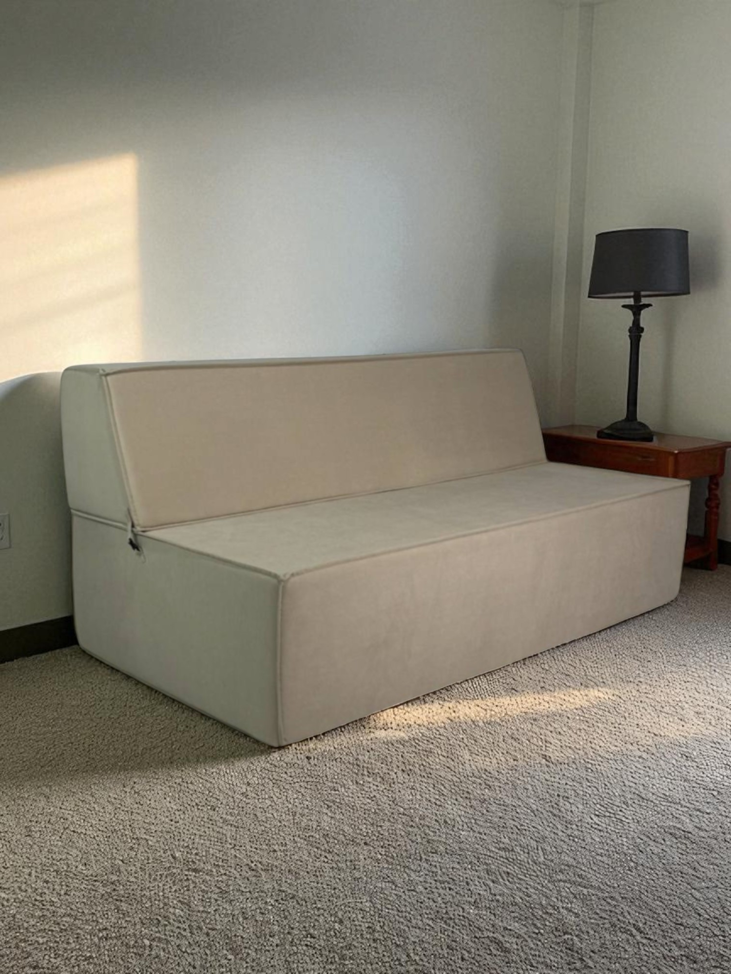 Вес дивана всего 30 кг. Дно дивана изготовлено из плотного кожзама. В процессе уборки его легко передвинет самая хрупкая девушка. Наружный чехол легко снимается благодаря застежкам-молниям для передачи его в химчистку.