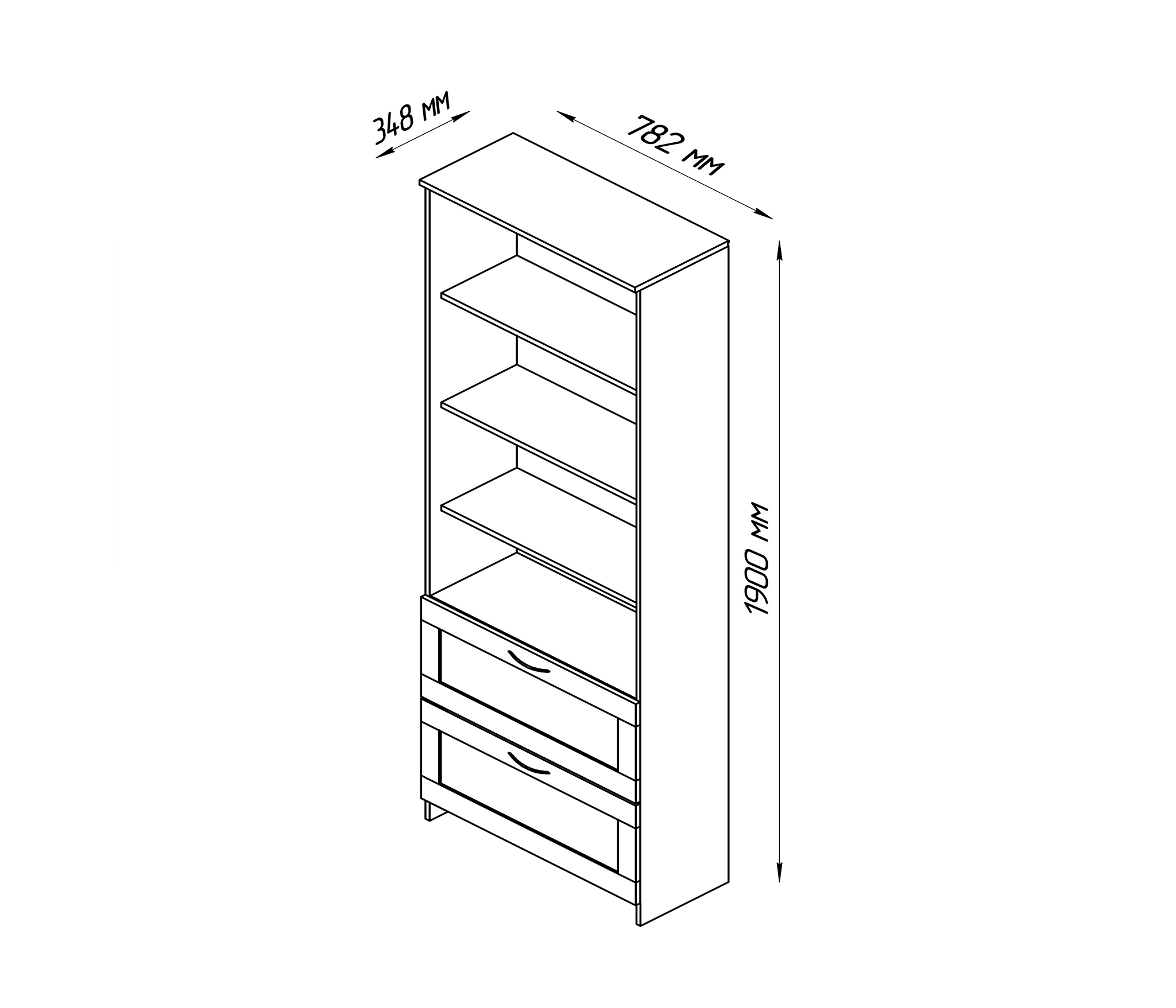 Стеллаж СИРИУС с четырьмя полками сверху и двумя выдвижными ящиками снизу, 782х348х1900. Изготовлен из кашированного ДСП толщиной 16 мм. Крепится к стене. Гарантийный срок для жилых помещений 24 месяца, для общественных помещений - 18 месяцев.