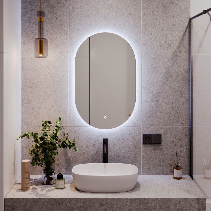Безрамное зеркало овальной (капсульной) формы с контурной (тыльной) холодной подсветкой, свет 6000К. Подложка из высококачественного МДФ, светодиодная лента защищена матовым свето-рассеивателем от попадания пыли и влаги. Есть вывод 220W для подключения к сети (блок питания подсветки 12V), включение подсветки от сенсорной кнопки на зеркале.