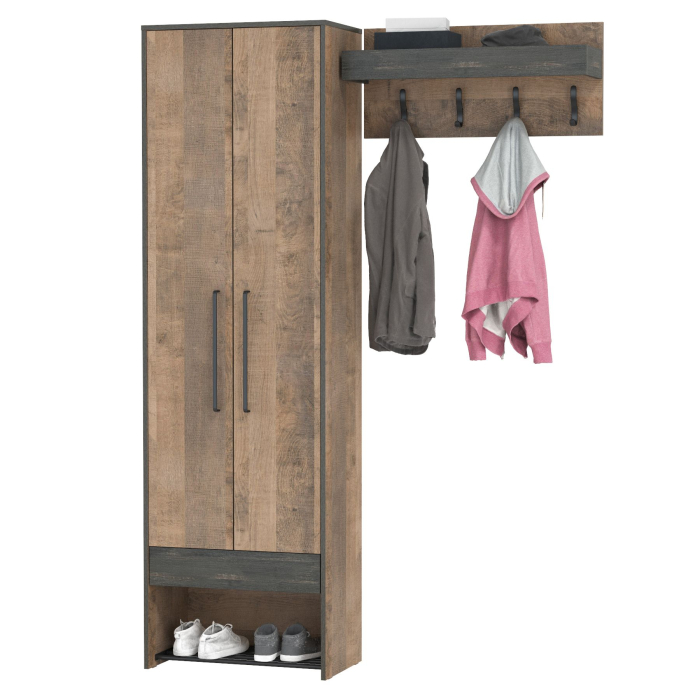 Брутальный декор и контрастная кромка, как и лицевая фурнитура придаёт мебели индустриальную эстетику. Комплектация состоит из шкафа для одежды Трувор 13.328.02 и навесной вешалки Трувор 15.04. Двустворчатый шкаф Трувор 13.328.02 за дверками которого располагается антресольная полка и выдвижная штанга для одежды на плечиках. Снизу под отделением с дверками расположен выдвижной ящик и ниша для 3 пар обуви с металлической решеткой-подставкой. На нижних кромках опор шкафа предусмотрены пластиковые подпятники для защиты поверхности пола от механических повреждений. Направляющие выдвижного ящика скрытого монтажа и четырёхшарнирные петли шкафа оснащены доводчиками, что обеспечивает повышенный комфорт и надёжность. Навесная вешалка Трувор 15.04 с четырьмя двухрожковыми крючками и полкой. Полка для головных уборов оборудованна бортиком. Максимальная нагрузка на каждый кручек - 1,5 кг, на полку - 3 кг. Вешалка рассчитана для малогаборитных помещений (прихожих, балконов), по приемлемой цене.