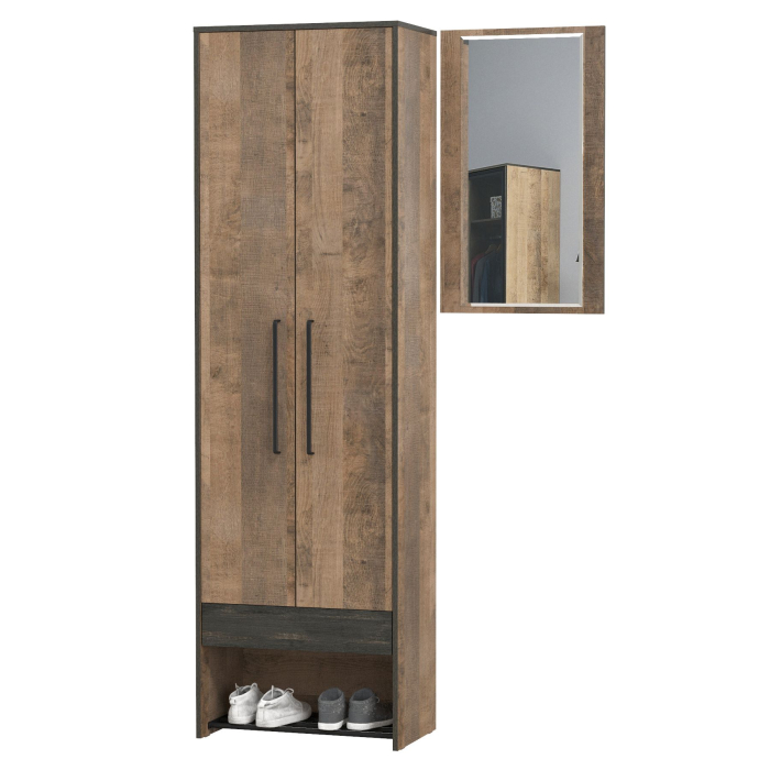 Брутальный декор и контрастная кромка, как и лицевая фурнитура придаёт мебели индустриальную эстетику. Комплектация состоит из шкафа для одежды Трувор 13.328.02 и зеркала навесного Трувор 15.30. Двустворчатый шкаф Трувор 13.328.02 за дверками которого располагается антресольная полка и выдвижная штанга для одежды на плечиках. Снизу под отделением с дверками расположен выдвижной ящик и ниша для 3 пар обуви с металлической решеткой-подставкой. На нижних кромках опор шкафа предусмотрены пластиковые подпятники для защиты поверхности пола от механических повреждений. Направляющие выдвижного ящика скрытого монтажа и четырёхшарнирные петли шкафа оснащены доводчиками, что обеспечивает повышенный комфорт и надёжность. Классическое прямоугольное навесное зеркало Трувор 15.30 на панели из ЛДСП. Согласно Ваших запросов при установке зеркало возможно повесить как горизонтально, так и вертикально. Размер зеркала позволяет ему стать частью множества композиций. Зеркало 15.30 имеет декоративный скос фаски под углом по всему периметру полотна. Скрытые крепежи на задней поверхности и предусматривают выбор расположения зеркала.