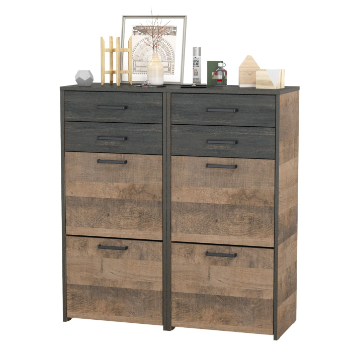 Две тумбы для обуви с двумя ящиками каждая Трувор вет - современная и практичная мебель в индустриальном стиле лофт. Брутальный декор и контрастная кромка, как и лицевая фурнитура придаёт мебели индустриальную эстетику. Комплектация состоит из двух тумб для обуви высоких Трувор 13.241.06. В комплектации 2 высоких обувницы. Каждая с двумя откидными дверками на 8 пар обуви и двумя выдвижными ящиками для хранения различных принадлежностей и мелких предметов. Направляющие выдвижных ящиков скрытого монтажа оснащены доводчиками, что обеспечивает повышенный комфорт и надёжность. На нижних кромках опор тумб предусмотрены пластиковые подпятники для защиты поверхности пола от механических повреждений.