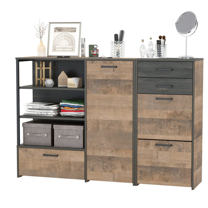 Брутальный декор и контрастная кромка, как и лицевая фурнитура придаёт мебели индустриальную эстетику. Комплектация состоит из тумбы для обуви высокой Трувор 13.241.06 и комода с дверкой Трувор 13.307.01. Вместительный комод Трувор 13.307.01 оснащен двумя полками за распашной дверкой с одной стороны и тремя открытыми нишами и выдвижным ящиком снизу с другой. Комод 13.307.01 имеет универсальную сборку, что позволяет расположить дверку как справа, так и слева. Металлические элементы делают этот комод надёжным, аутентичным и функциональным. Высокая обувница Трувор 13.241.06 с двумя откидными дверками на 8 пар обуви и двумя выдвижными ящиками для хранения различных принадлежностей и мелких предметов. На нижних кромках опор предусмотрены пластиковые подпятники для защиты поверхности пола от механических повреждений. Направляющие выдвижных ящиков скрытого монтажа и четырёхшарнирные петли оснащены доводчиками, что обеспечивает повышенный комфорт и надёжность.