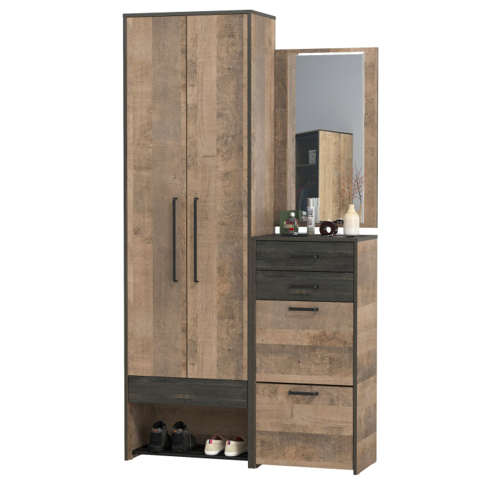 Брутальный декор и контрастная кромка, как и лицевая фурнитура придаёт мебели индустриальную эстетику. Комплектация состоит из шкафа для одежды Трувор 13.328.02, тумбы для обуви высокой Трувор 13.241.06 и зеркала навесного Трувор 15.30. Двустворчатый шкаф Трувор 13.328.02 за дверками которого располагается антресольная полка и выдвижная штанга для одежды на плечиках. Снизу под отделением с дверками расположен выдвижной ящик и ниша для 3 пар обуви с металлической решеткой-подставкой. Высокая обувница Трувор 13.241.06 с двумя откидными дверками на 8 пар обуви и двумя выдвижными ящиками для хранения различных принадлежностей и мелких предметов. На нижних кромках опор предусмотрены пластиковые подпятники для защиты поверхности пола от механических повреждений. Направляющие выдвижных ящиков скрытого монтажа и четырёхшарнирные петли оснащены доводчиками, что обеспечивает повышенный комфорт и надёжность. Классическое прямоугольное навесное зеркало Трувор 15.30 на панели из ЛДСП. Согласно Ваших запросов при установке зеркало возможно повесить как горизонтально, так и вертикально. Размер зеркала позволяет ему стать частью множества композиций. Зеркало 15.30 имеет декоративный скос фаски под углом по всему периметру полотна. Скрытые крепежи на задней поверхности и предусматривают выбор расположения зеркала.