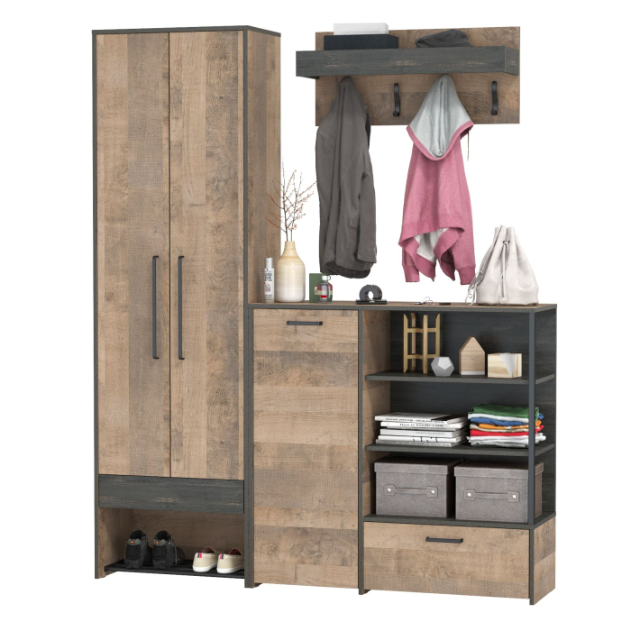 Брутальный декор и контрастная кромка, как и лицевая фурнитура придаёт мебели индустриальную эстетику. Комплектация состоит из шкафа для одежды Трувор 13.328.02, комода с дверкой Трувор 13.307.01 и навесной вешалки Трувор 15.04. Двустворчатый шкаф Трувор 13.328.02 за дверками которого располагается антресольная полка и выдвижная штанга для одежды на плечиках. Снизу под отделением с дверками расположен выдвижной ящик и ниша для 3 пар обуви с металлической решеткой-подставкой. Вместительный комод Трувор 13.307.01 оснащен двумя полками за распашной дверкой с одной стороны и тремя открытыми нишами и выдвижным ящиком снизу с другой. Комод 13.307.01 имеет универсальную сборку, что позволяет расположить дверку как справа, так и слева. На нижних кромках опор предусмотрены пластиковые подпятники для защиты поверхности пола от механических повреждений. Направляющие выдвижных ящиков скрытого монтажа и четырёхшарнирные петли оснащены доводчиками, что обеспечивает повышенный комфорт и надёжность. Металлические элементы делают этот комод надёжным, аутентичным и функциональным. Навесная вешалка Трувор 15.04 с четырьмя двухрожковыми крючками и полкой. Полка для головных уборов оборудованна бортиком. Максимальная нагрузка на каждый кручек - 1,5 кг, на полку - 3 кг. Вешалка рассчитана для малогаборитных помещений (прихожих, балконов), по приемлемой цене.