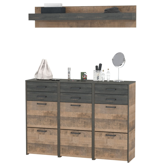Брутальный декор и контрастная кромка, как и лицевая фурнитура придаёт мебели индустриальную эстетику. Комплектация состоит из трех тумб для обуви высоких Трувор 13.241.06 и полки Трувор 15.60. В комплектации 3 высоких обувницы. Каждая с двумя откидными дверками на 8 пар обуви и двумя выдвижными ящиками для хранения различных принадлежностей и мелких предметов. Направляющие выдвижных ящиков скрытого монтажа оснащены доводчиками, что обеспечивает повышенный комфорт и надёжность. На нижних кромках опор предусмотрены пластиковые подпятники для защиты поверхности пола от механических повреждений. Классическая навесная открытая полка Трувор 15.60 с задней панелью. Полка располагается по центру панели и оборудована бортиком. Полку 15.60 можно использовать как книжную, а также для размещения элементов декора, поделок и фоторгафий. Полка имеет с обратной стороны панели скрытые крепленния. Максимальная нагрузка на полку составляет 3 кг.