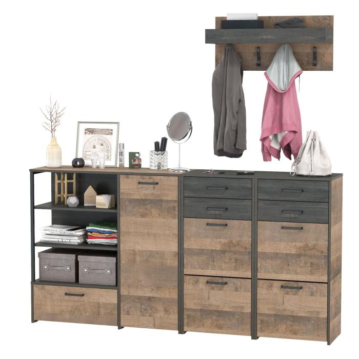 Брутальный декор и контрастная кромка, как и лицевая фурнитура придаёт мебели индустриальную эстетику. Комплектация состоит из двух тумб для обуви высоких Трувор 13.241.06, комода с дверкой Трувор 13.307.01 и навесной вешалки Трувор 15.04. Вместительный комод Трувор 13.307.01 оснащен двумя полками за распашной дверкой с одной стороны и тремя открытыми нишами и выдвижным ящиком снизу с другой. Комод 13.307.01 имеет универсальную сборку, что позволяет расположить дверку как справа, так и слева. Металлические элементы делают этот комод надёжным, аутентичным и функциональным. В комплектации 2 высоких обувницы. Каждая с двумя откидными дверками на 8 пар обуви и двумя выдвижными ящиками для хранения различных принадлежностей и мелких предметов. На нижних кромках опор предусмотрены пластиковые подпятники для защиты поверхности пола от механических повреждений. Направляющие выдвижных ящиков скрытого монтажа и четырёхшарнирные петли оснащены доводчиками, что обеспечивает повышенный комфорт и надёжность. Навесная вешалка Трувор 15.04 с четырьмя двухрожковыми крючками и полкой. Полка для головных уборов оборудованна бортиком. Максимальная нагрузка на каждый кручек - 1,5 кг, на полку - 3 кг. Вешалка рассчитана для малогаборитных помещений (прихожих, балконов), по приемлемой цене.