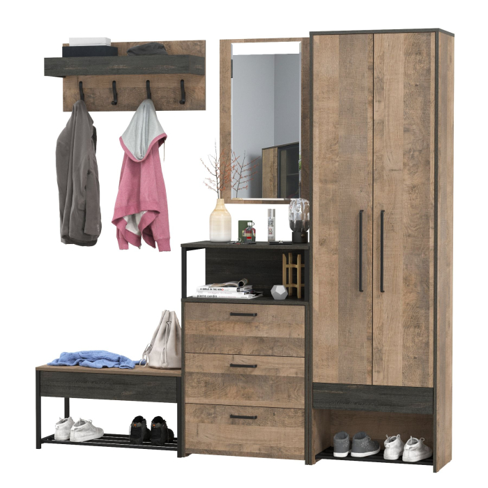 Брутальный декор и контрастная кромка, как и лицевая фурнитура придаёт мебели индустриальную эстетику. Комплектация состоит из шкафа для одежды Трувор 13.328.02, комода с ящиками Трувор 13.307.02, обувницы с сиденьем Трувор 13.241.03, навесной вешалки Трувор 15.04 и зеркала навесного Трувор 15.30. Двустворчатый шкаф Трувор 13.328.02 за дверками которого располагается антресольная полка и выдвижная штанга для одежды на плечиках. Снизу под отделением с дверками расположен выдвижной ящик и ниша для 3 пар обуви с металлической решеткой-подставкой. Вместительный и аккуратный комод Трувор 13.307.02 оснащен тремя выжвижными ящиками и открытой нишей сверху. Металлические элементы делают этот комод надёжным, аутентичным и функциональным. Низкая обувница Трувор 13.241.03 на 3 пары обуви с выдвижным ящиком для хранения различных принадлежностей и мелких предметов. Вместо боковых стоек использованы металлические опоры. Снизу металлическая подставка для обуви. Тумбу можно использовать в качестве подставки для сумок или банкетки для переобувания. Металлические опоры и подставка для обуви делают эту мебель надёжной, аутентичной и функциональной. На нижних кромках опор предусмотрены пластиковые подпятники для защиты поверхности пола от механических повреждений. Направляющие выдвижных ящиков скрытого монтажа и четырёхшарнирные петли оснащены доводчиками, что обеспечивает повышенный комфорт и надёжность. Навесная вешалка Трувор 15.04 с четырьмя двухрожковыми крючками и полкой. Полка для головных уборов оборудованна бортиком. Максимальная нагрузка на каждый кручек - 1,5 кг, на полку - 3 кг. Вешалка рассчитана для малогаборитных помещений (прихожих, балконов), по приемлемой цене. Классическое прямоугольное навесное зеркало Трувор 15.30 на панели из ЛДСП. Согласно Ваших запросов при установке зеркало возможно повесить как горизонтально, так и вертикально. Размер зеркала позволяет ему стать частью множества композиций. Зеркало 15.30 имеет декоративный скос фаски под углом по всему периметру полотна. Скрытые крепежи на задней поверхности и предусматривают выбор расположения зеркала.