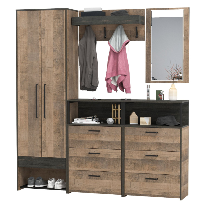 Брутальный декор и контрастная кромка, как и лицевая фурнитура придаёт мебели индустриальную эстетику. Комплектация состоит из шкафа для одежды Трувор 13.328.02, двух комодов с ящиками Трувор 13.307.02, навесной вешалки Трувор 15.04 и зеркала навесного Трувор 15.30. Двустворчатый шкаф Трувор 13.328.02 за дверками которого располагается антресольная полка и выдвижная штанга для одежды на плечиках. Снизу под отделением с дверками расположен выдвижной ящик и ниша для 3 пар обуви с металлической решеткой-подставкой. В комплектации 2 комода Трувор 13.307.02. Каждый оснащен тремя выжвижными ящиками и открытой нишей сверху. Металлические элементы делают этот комод надёжным, аутентичным и функциональным. Направляющие выдвижных ящиков скрытого монтажа и четырёхшарнирные петли оснащены доводчиками, что обеспечивает повышенный комфорт и надёжность. На нижних кромках опор предусмотрены пластиковые подпятники для защиты поверхности пола от механических повреждений. Навесная вешалка Трувор 15.04 с четырьмя двухрожковыми крючками и полкой. Полка для головных уборов оборудованна бортиком. Максимальная нагрузка на каждый кручек - 1,5 кг, на полку - 3 кг. Вешалка рассчитана для малогаборитных помещений (прихожих, балконов), по приемлемой цене. Классическое прямоугольное навесное зеркало Трувор 15.30 на панели из ЛДСП. Согласно Ваших запросов при установке зеркало возможно повесить как горизонтально, так и вертикально. Размер зеркала позволяет ему стать частью множества композиций. Зеркало 15.30 имеет декоративный скос фаски под углом по всему периметру полотна. Скрытые крепежи на задней поверхности и предусматривают выбор расположения зеркала.