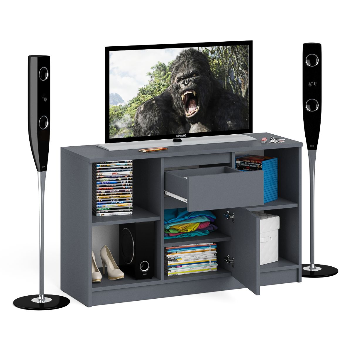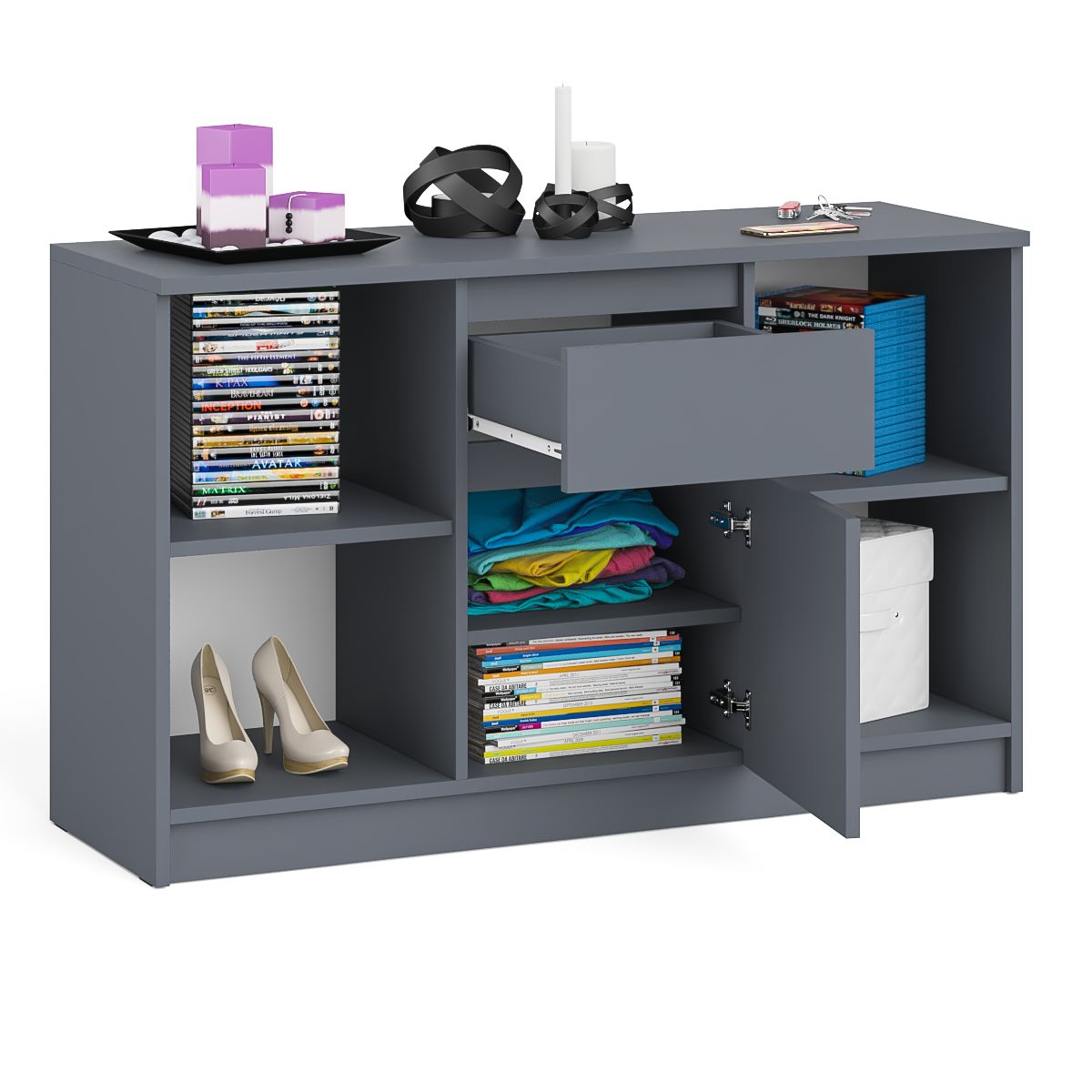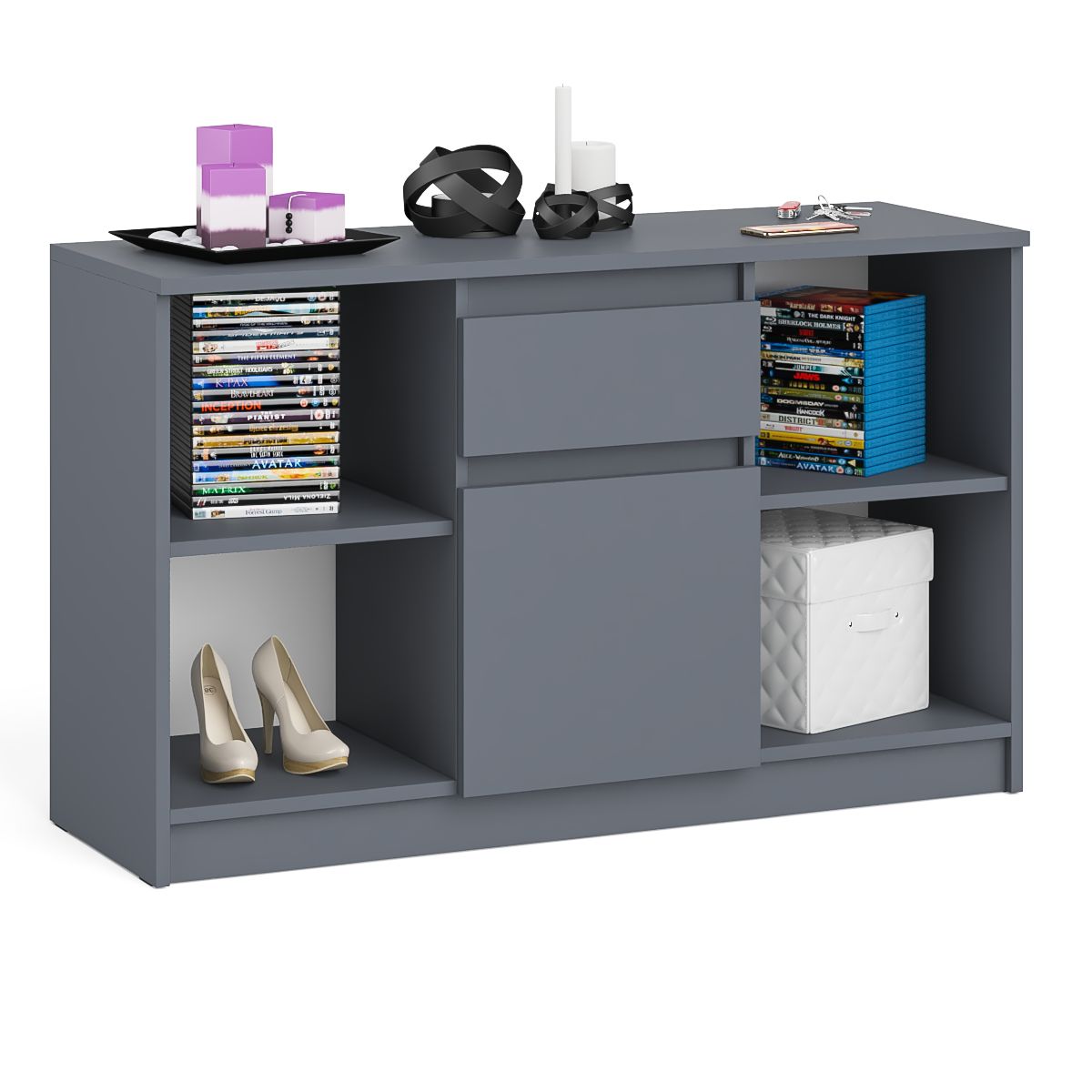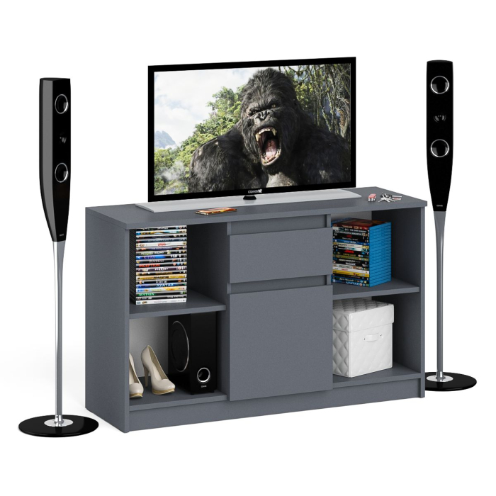 Тумба состоит из двух открытых ниш по бокам и ящика и закрытой нишей по центру. Все ниши имеет полочку по середине. На тумбе достаточно места для размещения телевизора дигональю 47 дюймов. Можно использовать как ТВ тумбу, так и обычную для хранения и размещения Ваших вещей. Продуманная конструкция позволяет убрать лишние предметы, тем самым сохраняя единый стиль оформления помещения. Отсутствие ручек главное преимущество данной модели. Роль ручек выполняют сами фасады. Открывание ящика и двери производится за счет пространства между планками и фасадами.