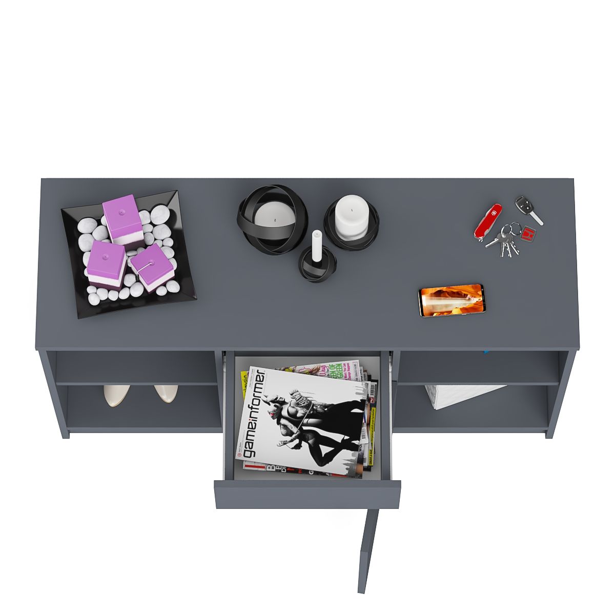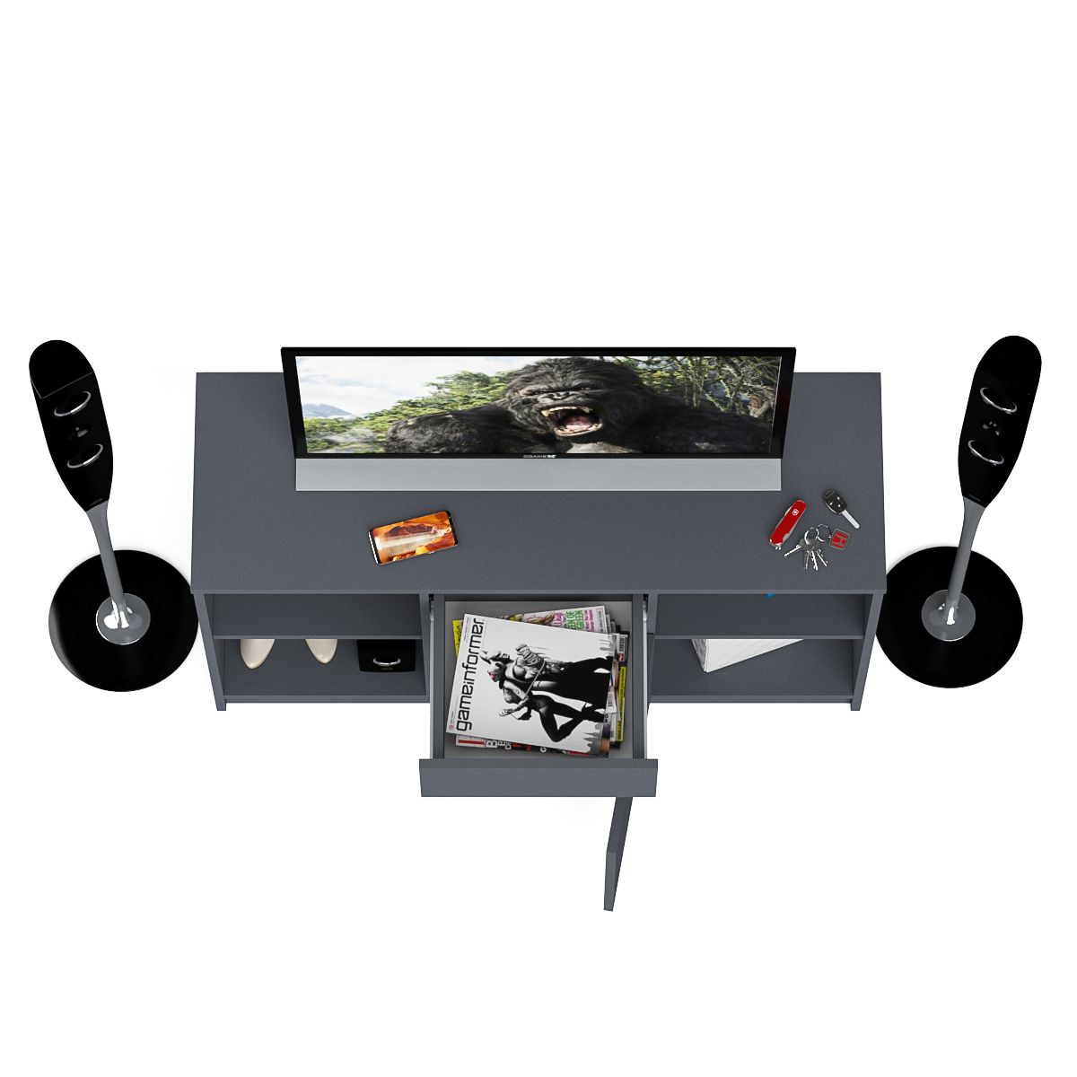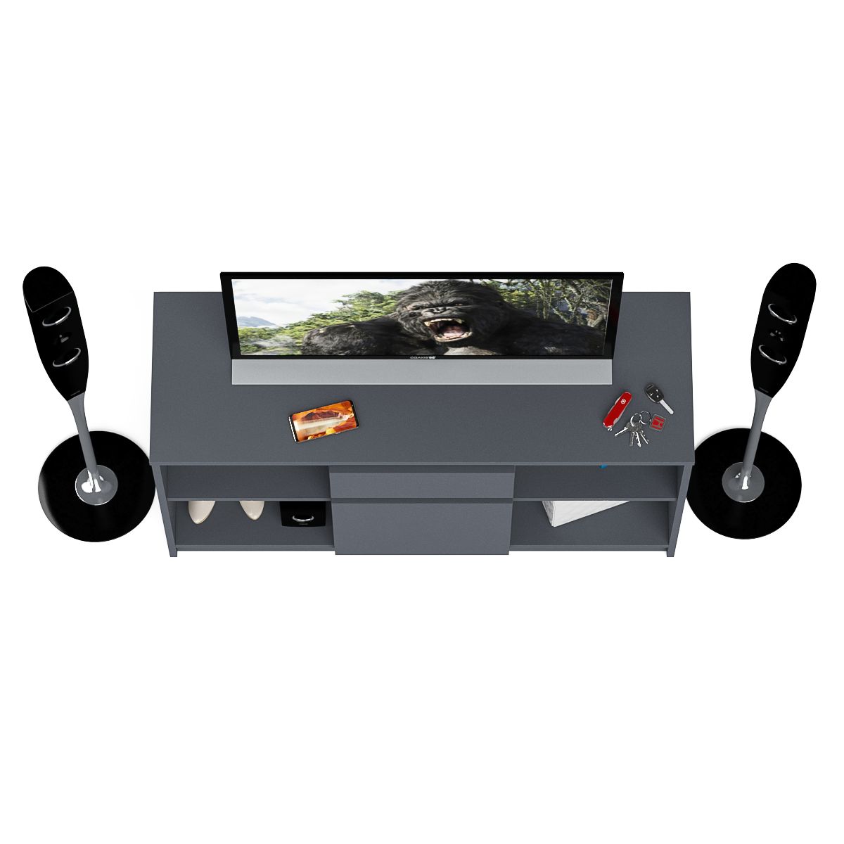 Тумба состоит из двух открытых ниш по бокам и ящика и закрытой нишей по центру. Все ниши имеет полочку по середине. На тумбе достаточно места для размещения телевизора дигональю 47 дюймов. Можно использовать как ТВ тумбу, так и обычную для хранения и размещения Ваших вещей. Продуманная конструкция позволяет убрать лишние предметы, тем самым сохраняя единый стиль оформления помещения. Отсутствие ручек главное преимущество данной модели. Роль ручек выполняют сами фасады. Открывание ящика и двери производится за счет пространства между планками и фасадами.