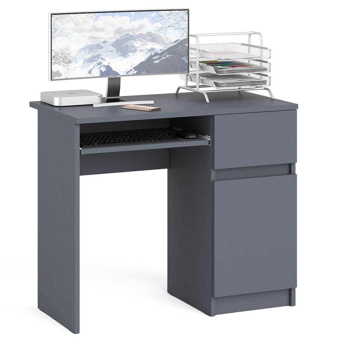 Аккуратный стол компьютерный с тумбой и выдвижной панелью для клавиатуры. Тумба имеет нишу с полочкой за распашной дверкой и выдвижной ящик на роликовых направляющих. Стол компьютерный Мори МС-1 правый не имеет универсальной сборки - выдвижной ящик расположен справа. Продуманная конструкция позволяет убрать лишние предметы, тем самым сохраняя единый стиль оформления помещения. Отсутствие ручек главное преимущество данной модели. Роль ручек выполняют сами фасады. Открывание ящиков и дверки производится за счет пространства между планками и фасадами. Выдвижной ящик на роликовых направляющих L=350 мм. неполного выдвижения обеспечивают комфортную эксплуатацию. На нижних кромках опор предусмотрены пластиковые подпятники для защиты поверхности пола от механических повреждений.