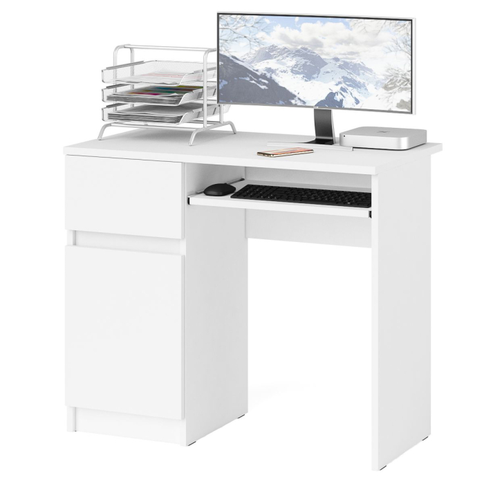 Аккуратный стол компьютерный с тумбой и выдвижной панелью для клавиатуры. Тумба имеет нишу с полочкой за распашной дверкой и выдвижной ящик на роликовых направляющих. Стол компьютерный Мори МС-1 левый не имеет универсальной сборки - выдвижной ящик расположен слева. Продуманная конструкция позволяет убрать лишние предметы, тем самым сохраняя единый стиль оформления помещения. Отсутствие ручек главное преимущество данной модели. Роль ручек выполняют сами фасады. Открывание ящиков и дверки производится за счет пространства между планками и фасадами. Выдвижной ящик на роликовых направляющих L=350 мм. неполного выдвижения обеспечивают комфортную эксплуатацию. На нижних кромках опор предусмотрены пластиковые подпятники для защиты поверхности пола от механических повреждений.