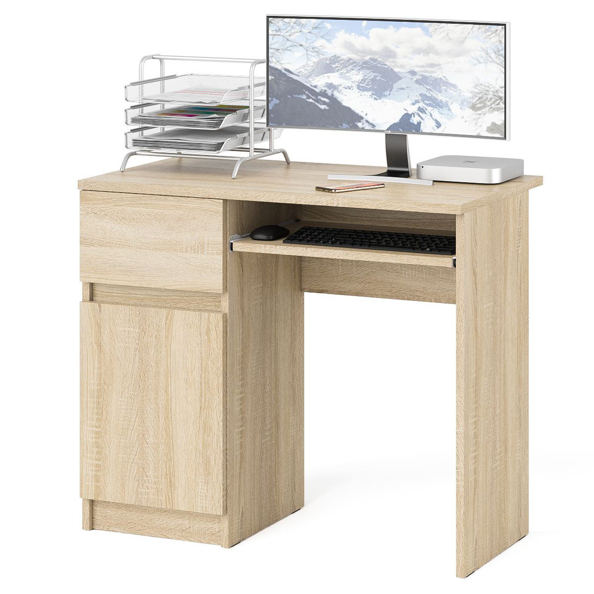 Аккуратный стол компьютерный с тумбой и выдвижной панелью для клавиатуры. Тумба имеет нишу с полочкой за распашной дверкой и выдвижной ящик на роликовых направляющих. Стол компьютерный Мори МС-1 левый не имеет универсальной сборки - выдвижной ящик расположен слева. Продуманная конструкция позволяет убрать лишние предметы, тем самым сохраняя единый стиль оформления помещения. Отсутствие ручек главное преимущество данной модели. Роль ручек выполняют сами фасады. Открывание ящиков и дверки производится за счет пространства между планками и фасадами. Выдвижной ящик на роликовых направляющих L=350 мм. неполного выдвижения обеспечивают комфортную эксплуатацию. На нижних кромках опор предусмотрены пластиковые подпятники для защиты поверхности пола от механических повреждений.