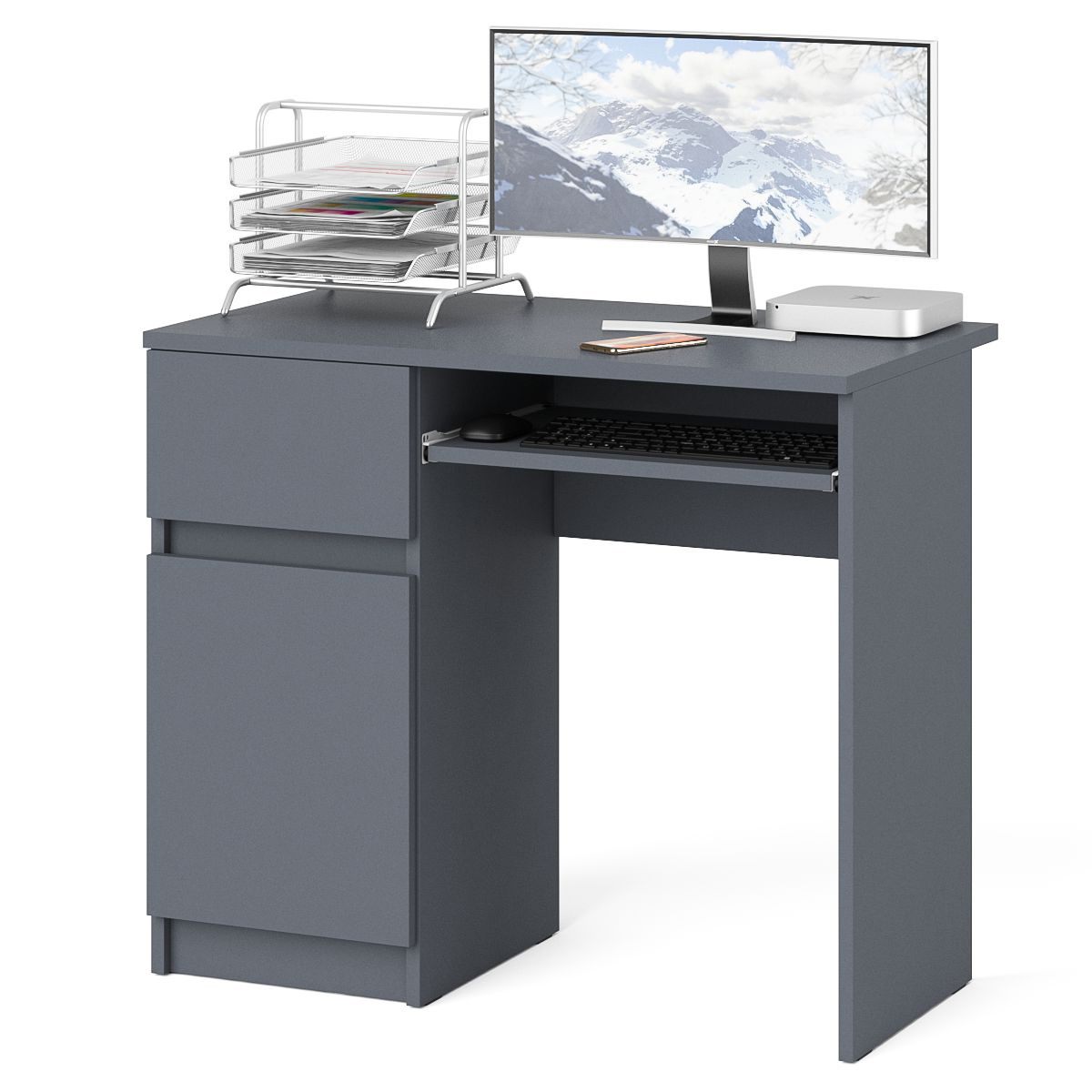 Аккуратный стол компьютерный с тумбой и выдвижной панелью для клавиатуры. Тумба имеет нишу с полочкой за распашной дверкой и выдвижной ящик на роликовых направляющих. Стол компьютерный Мори МС-1 левый не имеет универсальной сборки - выдвижной ящик расположен слева. Продуманная конструкция позволяет убрать лишние предметы, тем самым сохраняя единый стиль оформления помещения. Отсутствие ручек главное преимущество данной модели. Роль ручек выполняют сами фасады. Открывание ящиков и дверки производится за счет пространства между планками и фасадами. Выдвижной ящик на роликовых направляющих L=350 мм. неполного выдвижения обеспечивают комфортную эксплуатацию. На нижних кромках опор предусмотрены пластиковые подпятники для защиты поверхности пола от механических повреждений.