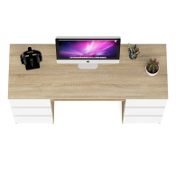 Компьютерный стол оборудован шестью ящиками и выдвижной полкой для клавиатуры. Под столешницей по бокам расположены две тумбы с тремя выдвижными ящиками в каждой. Продуманная конструкция позволяет убрать лишние предметы, тем самым сохраняя единый стиль оформления помещения. Отсутствие ручек главное преимущество данной модели. Роль ручек выполняют сами фасады. Открывание ящиков производится за счет пространства между планками и фасадами. Выдвижные ящики на роликовых направляющих L=350 мм. неполного выдвижения обеспечивают комфортную эксплуатацию. На нижних кромках опор предусмотрены пластиковые подпятники для защиты поверхности пола от механических повреждений.
