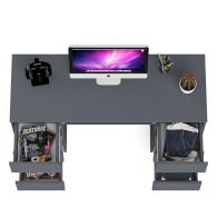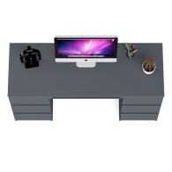 Компьютерный стол оборудован шестью ящиками и выдвижной полкой для клавиатуры. Под столешницей по бокам расположены две тумбы с тремя выдвижными ящиками в каждой. Продуманная конструкция позволяет убрать лишние предметы, тем самым сохраняя единый стиль оформления помещения. Отсутствие ручек главное преимущество данной модели. Роль ручек выполняют сами фасады. Открывание ящиков производится за счет пространства между планками и фасадами. Выдвижные ящики на роликовых направляющих L=350 мм. неполного выдвижения обеспечивают комфортную эксплуатацию. На нижних кромках опор предусмотрены пластиковые подпятники для защиты поверхности пола от механических повреждений.
