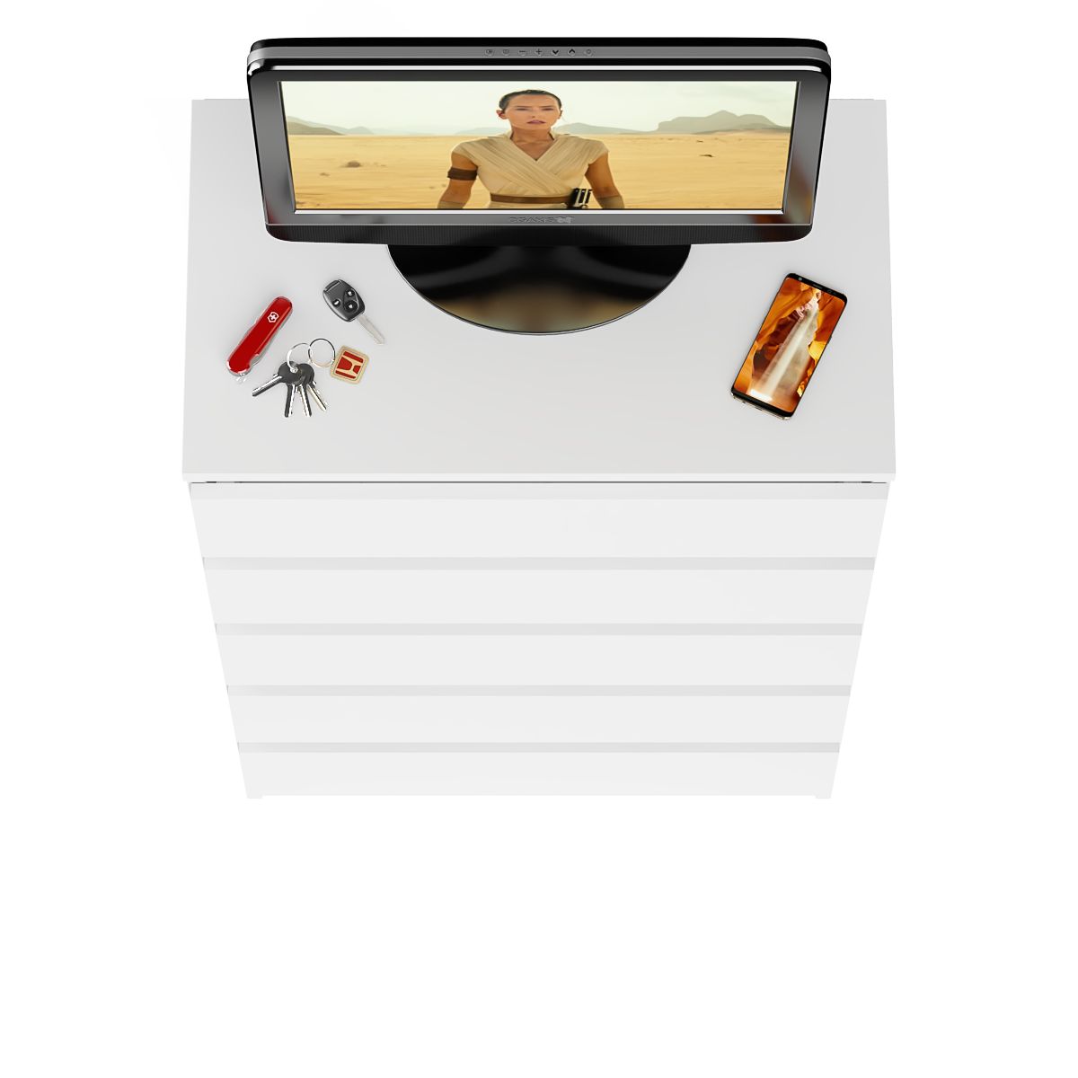 Узкий комод с пятью выдвижными ящиками. Продуманная конструкция позволяет убрать лишние предметы, тем самым сохраняя единый стиль оформления помещения. Отсутствие ручек главное преимущество данной модели. Роль ручек выполняют сами фасады. Открывание ящиков производится за счет пространства между планками и фасадами. Выдвижные ящики на роликовых направляющих L=350 мм. неполного выдвижения обеспечивают комфортную эксплуатацию. На нижних кромках опор предусмотрены пластиковые подпятники для защиты поверхности пола от механических повреждений.