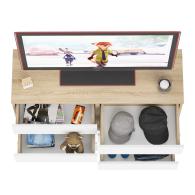 Комод оборудован шестью выдвижными ящиками, расположеными по три в два ряда. Продуманная конструкция позволяет убрать лишние предметы, тем самым сохраняя единый стиль оформления помещения. Отсутствие ручек главное преимущество данной модели. Роль ручек выполняют сами фасады. Открывание ящиков производится за счет пространства между планками и фасадами. Выдвижные ящики на роликовых направляющих L=350 мм. неполного выдвижения обеспечивают комфортную эксплуатацию. На нижних кромках опор предусмотрены пластиковые подпятники для защиты поверхности пола от механических повреждений.