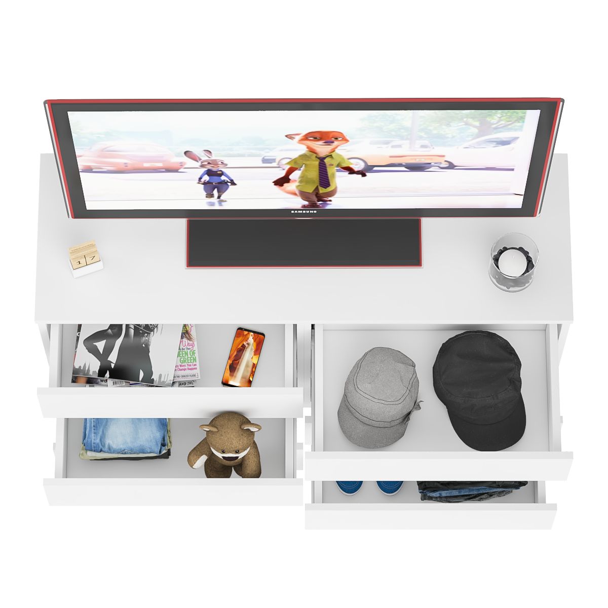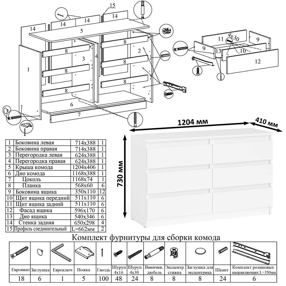Комод оборудован шестью выдвижными ящиками, расположеными по три в два ряда. Продуманная конструкция позволяет убрать лишние предметы, тем самым сохраняя единый стиль оформления помещения. Отсутствие ручек главное преимущество данной модели. Роль ручек выполняют сами фасады. Открывание ящиков производится за счет пространства между планками и фасадами. Выдвижные ящики на роликовых направляющих L=350 мм. неполного выдвижения обеспечивают комфортную эксплуатацию. На нижних кромках опор предусмотрены пластиковые подпятники для защиты поверхности пола от механических повреждений.