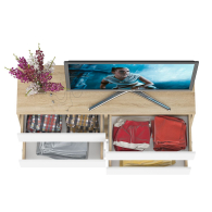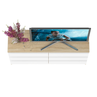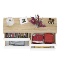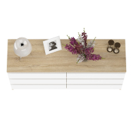 Широкий комод оборудован шестью выдвижными ящиками, расположеными по три в два ряда. Продуманная конструкция позволяет убрать лишние предметы, тем самым сохраняя единый стиль оформления помещения. Отсутствие ручек главное преимущество данной модели. Роль ручек выполняют сами фасады. Открывание ящиков производится за счет пространства между планками и фасадами. Выдвижные ящики на роликовых направляющих L=350 мм. неполного выдвижения обеспечивают комфортную эксплуатацию. На нижних кромках опор предусмотрены пластиковые подпятники для защиты поверхности пола от механических повреждений.