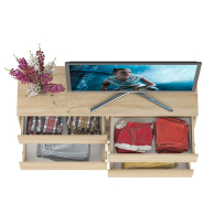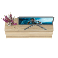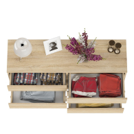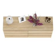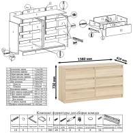 Широкий комод оборудован шестью выдвижными ящиками, расположеными по три в два ряда. Продуманная конструкция позволяет убрать лишние предметы, тем самым сохраняя единый стиль оформления помещения. Отсутствие ручек главное преимущество данной модели. Роль ручек выполняют сами фасады. Открывание ящиков производится за счет пространства между планками и фасадами. Выдвижные ящики на роликовых направляющих L=350 мм. неполного выдвижения обеспечивают комфортную эксплуатацию. На нижних кромках опор предусмотрены пластиковые подпятники для защиты поверхности пола от механических повреждений.