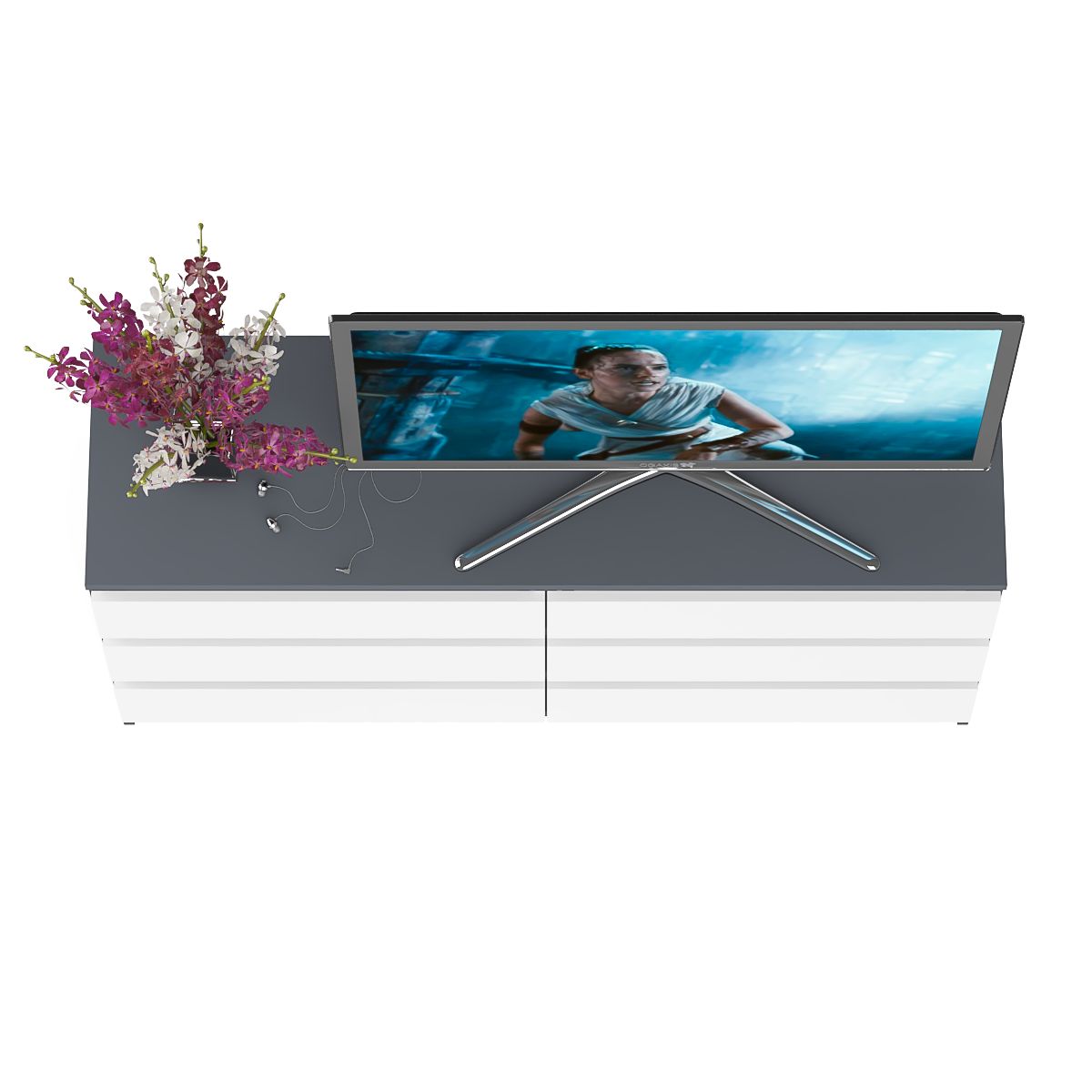 Широкий комод оборудован шестью выдвижными ящиками, расположеными по три в два ряда. Продуманная конструкция позволяет убрать лишние предметы, тем самым сохраняя единый стиль оформления помещения. Отсутствие ручек главное преимущество данной модели. Роль ручек выполняют сами фасады. Открывание ящиков производится за счет пространства между планками и фасадами. Выдвижные ящики на роликовых направляющих L=350 мм. неполного выдвижения обеспечивают комфортную эксплуатацию. На нижних кромках опор предусмотрены пластиковые подпятники для защиты поверхности пола от механических повреждений.