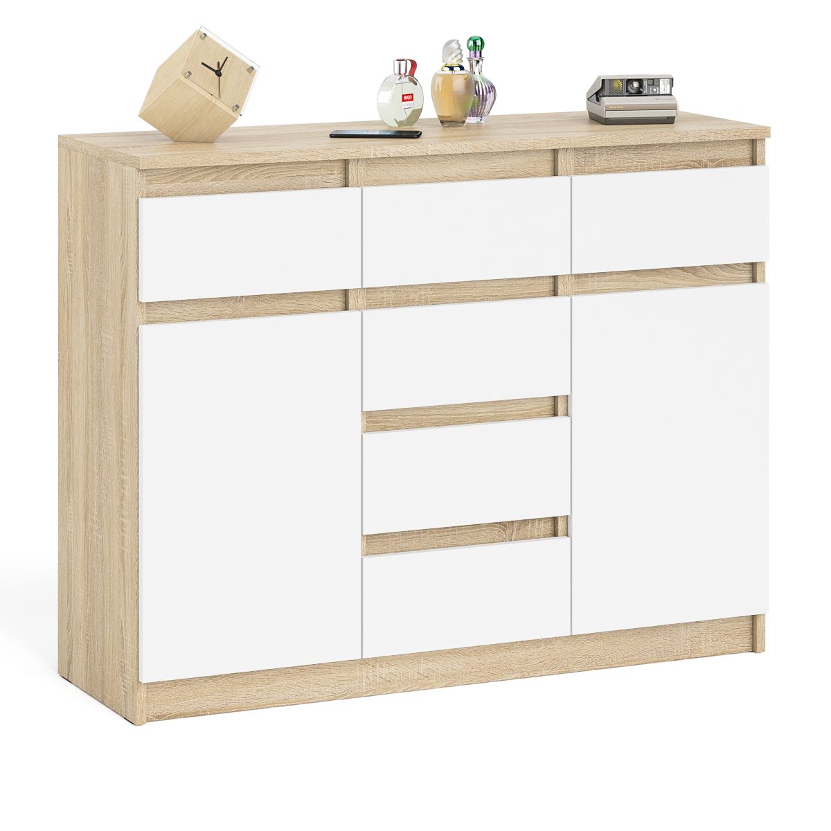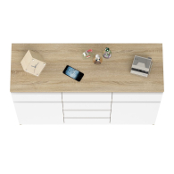 Комод оборудован шестью выдвижными ящиками и двумя закрытыми отделениями с полками. В верхней части комода расположены три ящика, под ними в центре отделение с ещё тремя ящиками и по бокам отделения с дверками. Продуманная конструкция позволяет убрать лишние предметы, тем самым сохраняя единый стиль оформления помещения. Отсутствие ручек главное преимущество данной модели. Роль ручек выполняют сами фасады. Открывание ящиков и дверей производится за счет пространства между планками и фасадами. Выдвижные ящики на роликовых направляющих L=350 мм. неполного выдвижения обеспечивают комфортную эксплуатацию. На нижних кромках опор предусмотрены пластиковые подпятники для защиты поверхности пола от механических повреждений.