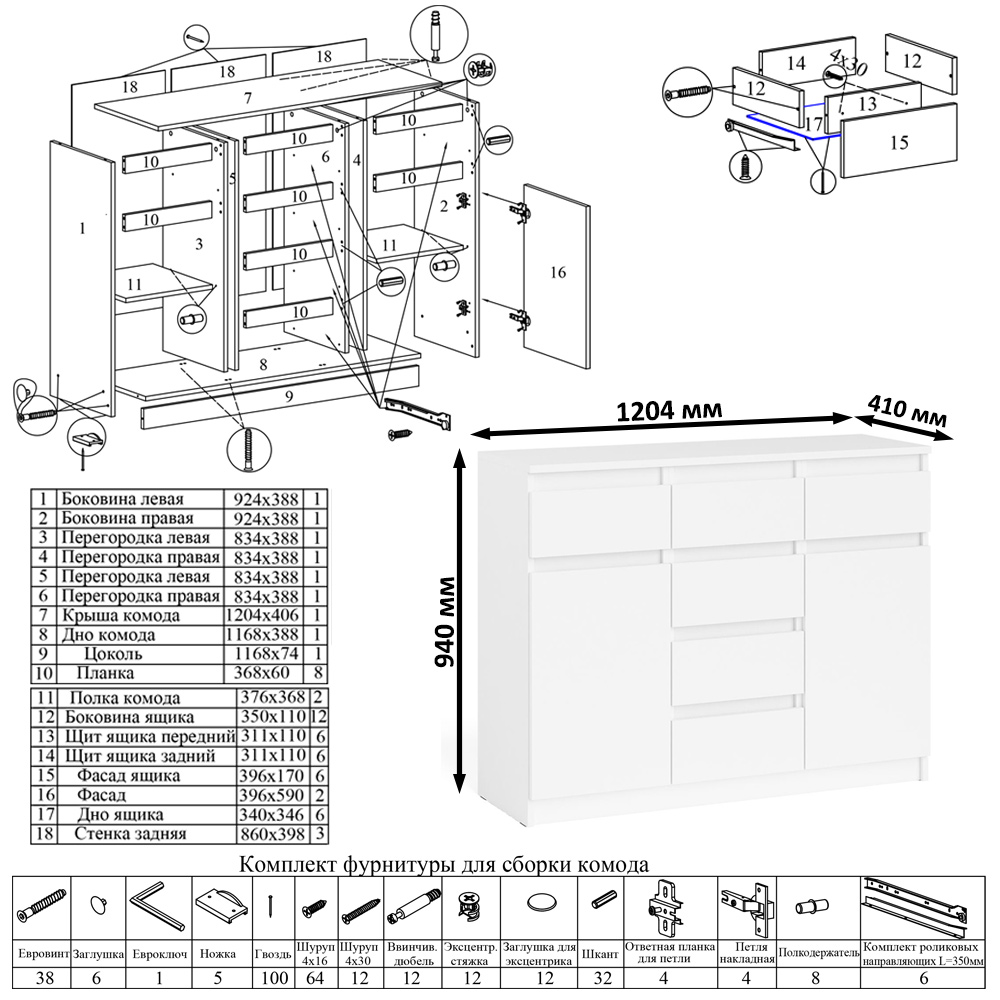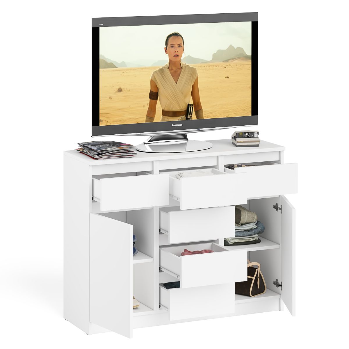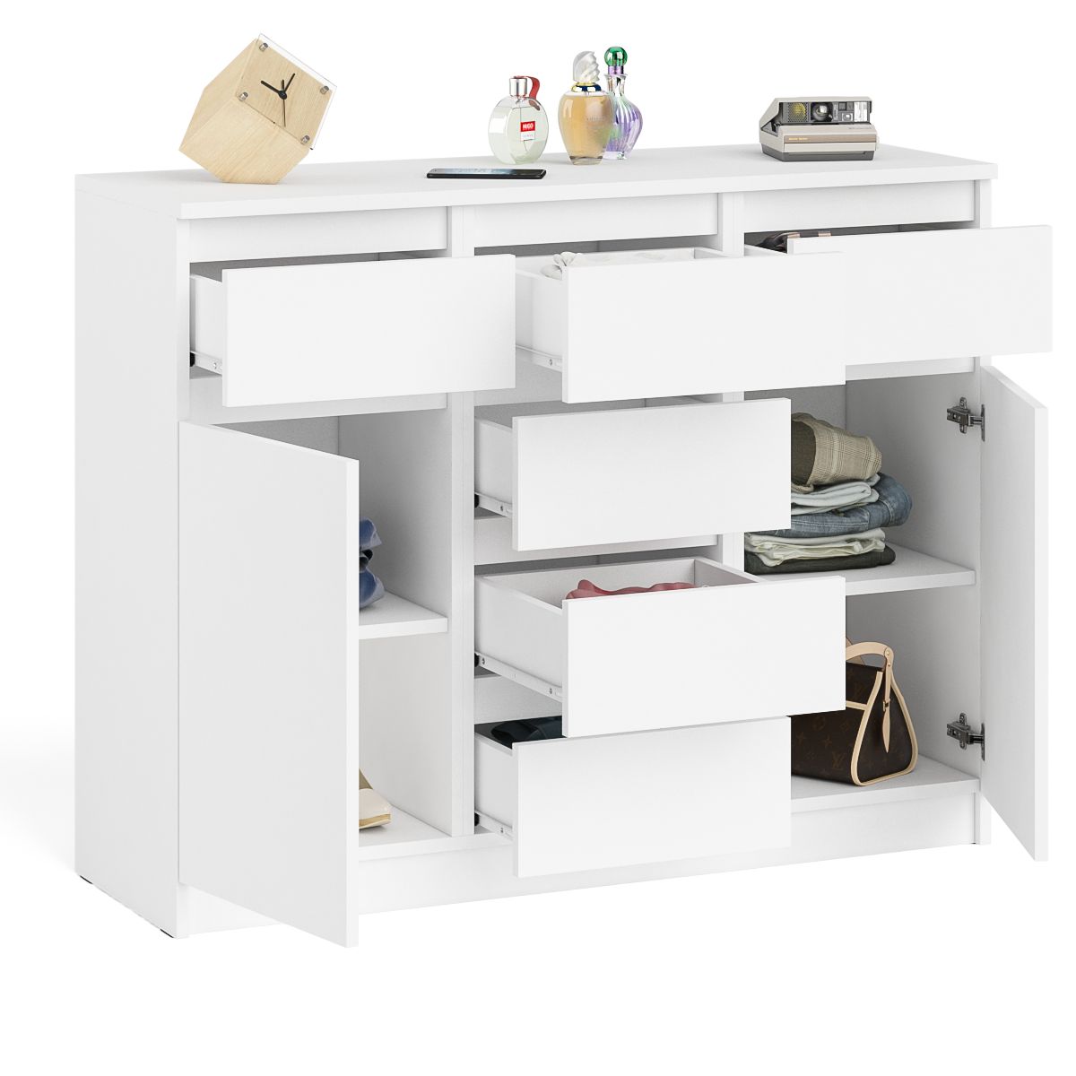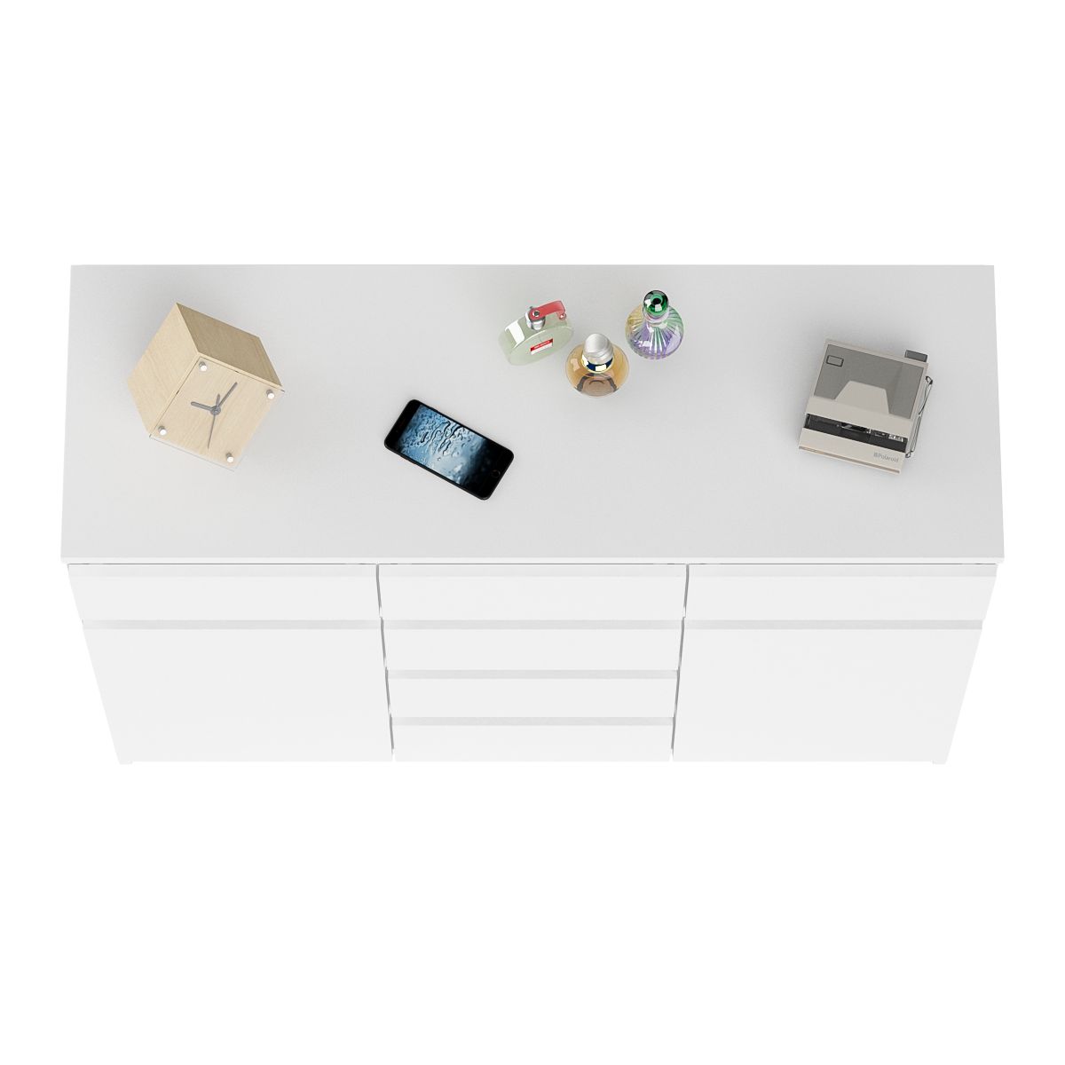 Комод оборудован шестью выдвижными ящиками и двумя закрытыми отделениями с полками. В верхней части комода расположены три ящика, под ними в центре отделение с ещё тремя ящиками и по бокам отделения с дверками. Продуманная конструкция позволяет убрать лишние предметы, тем самым сохраняя единый стиль оформления помещения. Отсутствие ручек главное преимущество данной модели. Роль ручек выполняют сами фасады. Открывание ящиков и дверей производится за счет пространства между планками и фасадами. Выдвижные ящики на роликовых направляющих L=350 мм. неполного выдвижения обеспечивают комфортную эксплуатацию. На нижних кромках опор предусмотрены пластиковые подпятники для защиты поверхности пола от механических повреждений.
