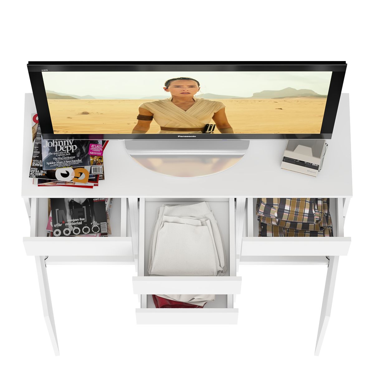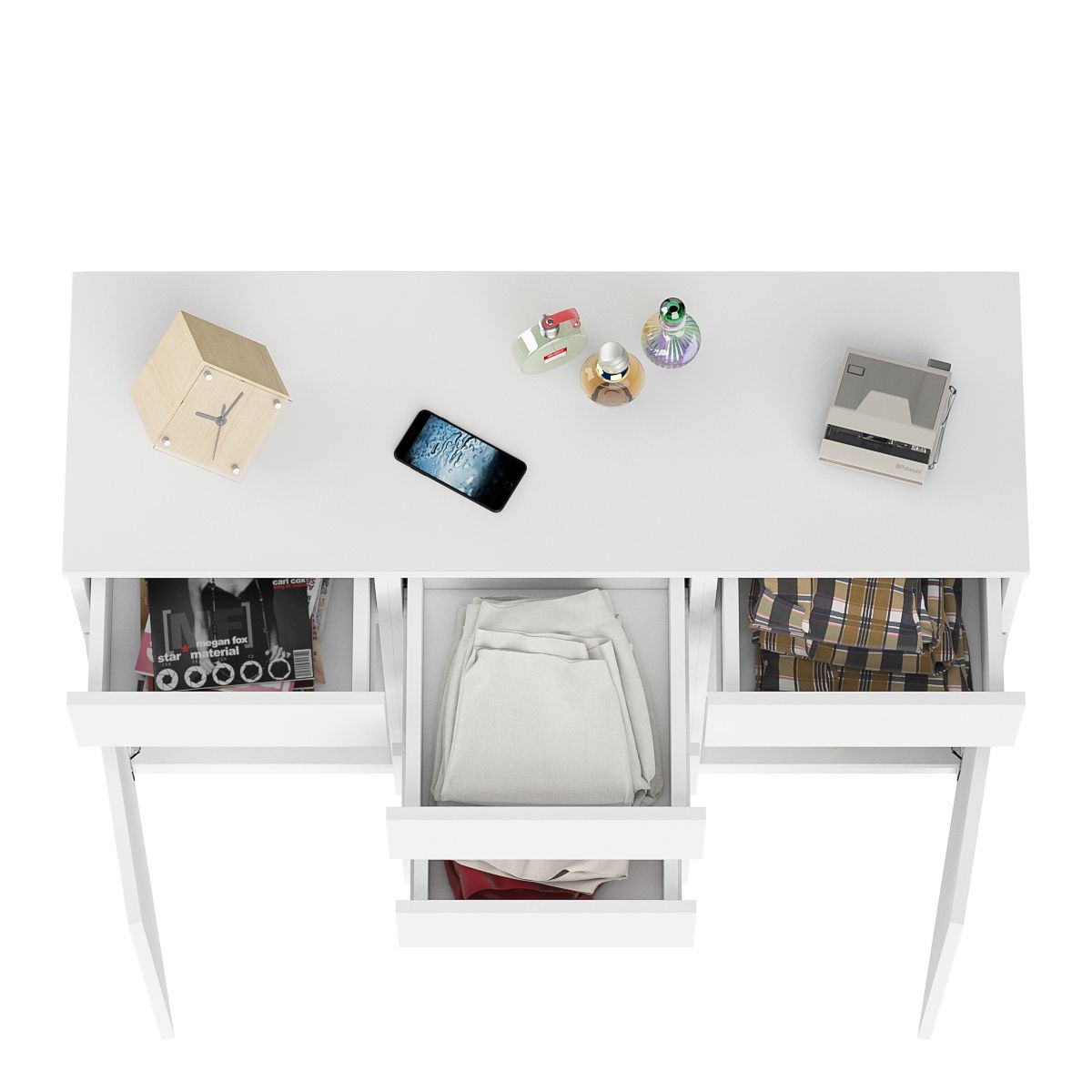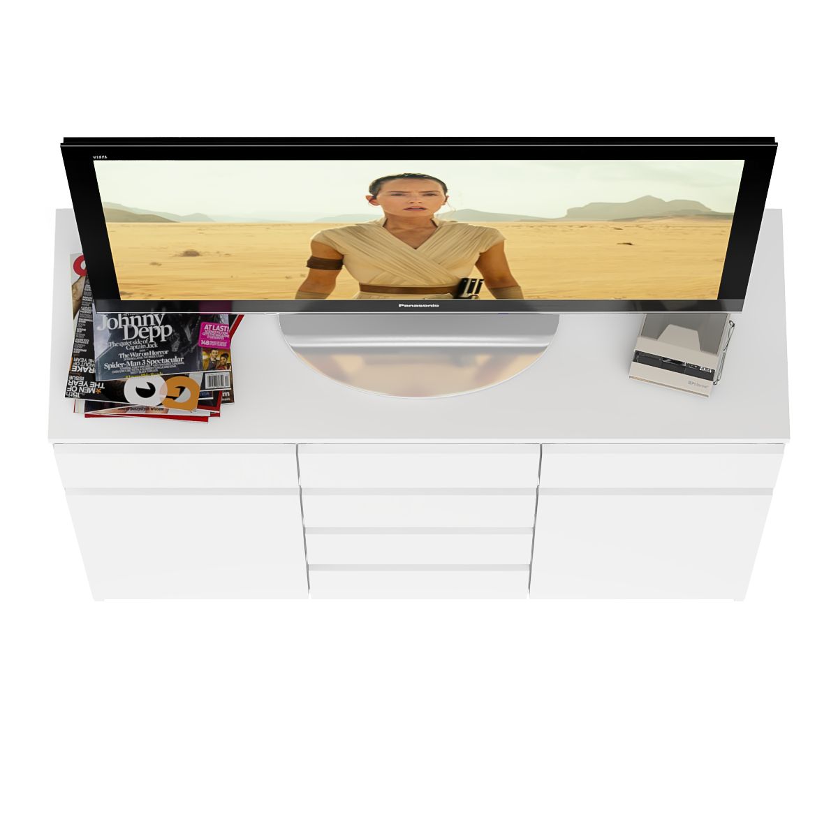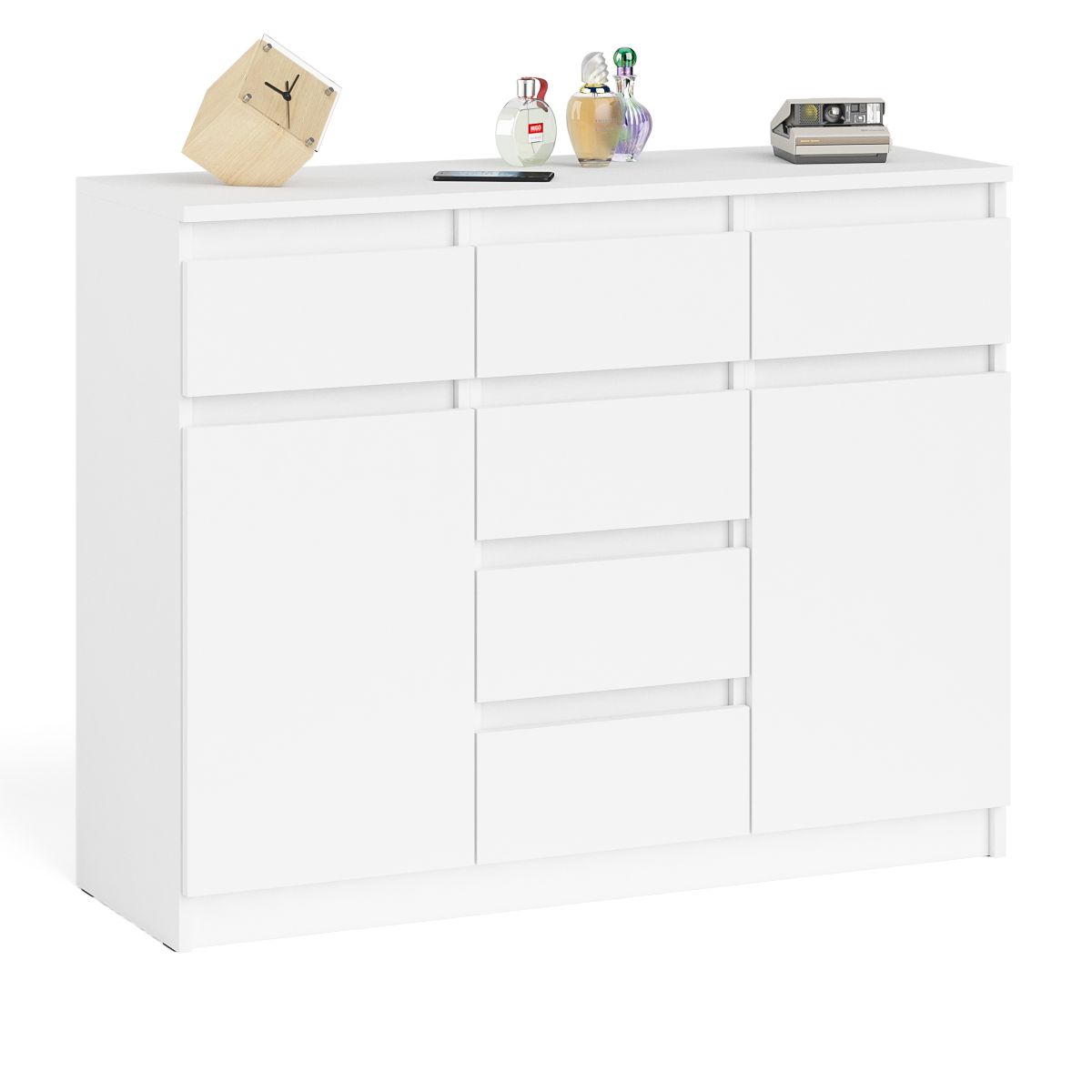 Комод оборудован шестью выдвижными ящиками и двумя закрытыми отделениями с полками. В верхней части комода расположены три ящика, под ними в центре отделение с ещё тремя ящиками и по бокам отделения с дверками. Продуманная конструкция позволяет убрать лишние предметы, тем самым сохраняя единый стиль оформления помещения. Отсутствие ручек главное преимущество данной модели. Роль ручек выполняют сами фасады. Открывание ящиков и дверей производится за счет пространства между планками и фасадами. Выдвижные ящики на роликовых направляющих L=350 мм. неполного выдвижения обеспечивают комфортную эксплуатацию. На нижних кромках опор предусмотрены пластиковые подпятники для защиты поверхности пола от механических повреждений.