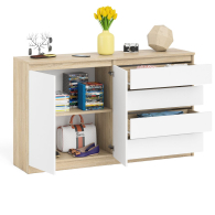Широкий комод оборудован четырьмя выдвижными ящиками с одной стороны и закрытым отделением с полкой за двумя распашными дверками. Комод не имеет универсальной сборки - ящики расположены справа. Продуманная конструкция позволяет убрать лишние предметы, тем самым сохраняя единый стиль оформления помещения. Отсутствие ручек главное преимущество данной модели. Роль ручек выполняют сами фасады. Открывание ящиков и дверей производится за счет пространства между планками и фасадами. Выдвижные ящики на роликовых направляющих L=350 мм. неполного выдвижения обеспечивают комфортную эксплуатацию. На нижних кромках опор предусмотрены пластиковые подпятники для защиты поверхности пола от механических повреждений.