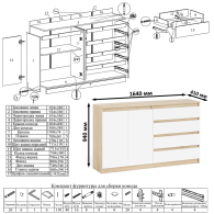 Корпус и фасады изготовлены из экологически чистой ламинированной ДСП 16 мм, торцы окромлены ПХВ плёнкой 0,4 мм. Лицевая фурнитура отсутствует - все фасады открываются за край. Поставляется в разобранном виде в надёжной упаковке, с комплектом сборочной фурнитуры и инструкцией по сборке.