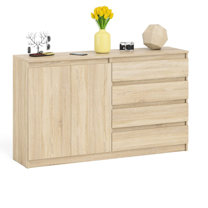 Широкий комод оборудован четырьмя выдвижными ящиками с одной стороны и закрытым отделением с полкой за двумя распашными дверками. Комод не имеет универсальной сборки - ящики расположены справа. Продуманная конструкция позволяет убрать лишние предметы, тем самым сохраняя единый стиль оформления помещения. Отсутствие ручек главное преимущество данной модели. Роль ручек выполняют сами фасады. Открывание ящиков и дверей производится за счет пространства между планками и фасадами. Выдвижные ящики на роликовых направляющих L=350 мм. неполного выдвижения обеспечивают комфортную эксплуатацию. На нижних кромках опор предусмотрены пластиковые подпятники для защиты поверхности пола от механических повреждений.