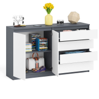 Широкий комод оборудован четырьмя выдвижными ящиками с одной стороны и закрытым отделением с полкой за двумя распашными дверками. Комод не имеет универсальной сборки - ящики расположены справа. Продуманная конструкция позволяет убрать лишние предметы, тем самым сохраняя единый стиль оформления помещения. Отсутствие ручек главное преимущество данной модели. Роль ручек выполняют сами фасады. Открывание ящиков и дверей производится за счет пространства между планками и фасадами. Выдвижные ящики на роликовых направляющих L=350 мм. неполного выдвижения обеспечивают комфортную эксплуатацию. На нижних кромках опор предусмотрены пластиковые подпятники для защиты поверхности пола от механических повреждений.