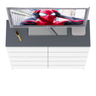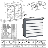 Комод оборудован десятью выдвижными ящиками, расположеными по пять в два ряда. Продуманная конструкция позволяет убрать лишние предметы, тем самым сохраняя единый стиль оформления помещения. Отсутствие ручек главное преимущество данной модели. Роль ручек выполняют сами фасады. Открывание ящиков производится за счет пространства между планками и фасадами. Выдвижные ящики на роликовых направляющих L=350 мм. неполного выдвижения обеспечивают комфортную эксплуатацию. На нижних кромках опор предусмотрены пластиковые подпятники для защиты поверхности пола от механических повреждений.