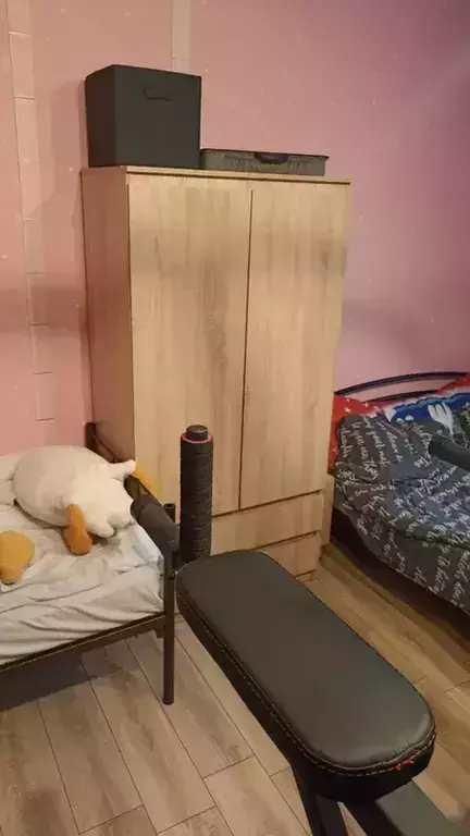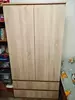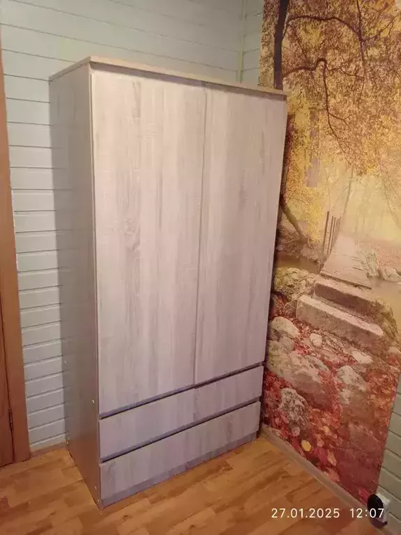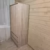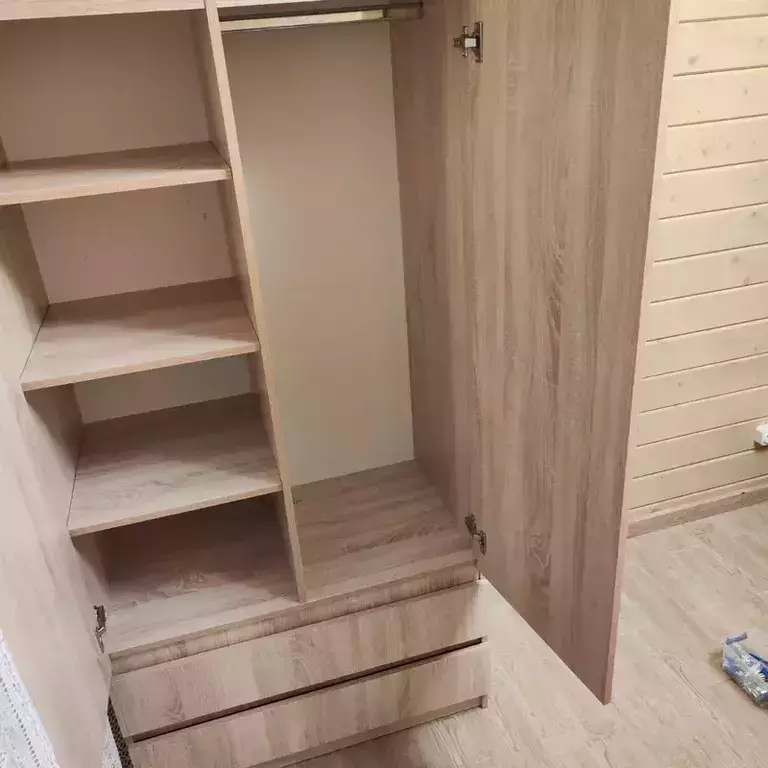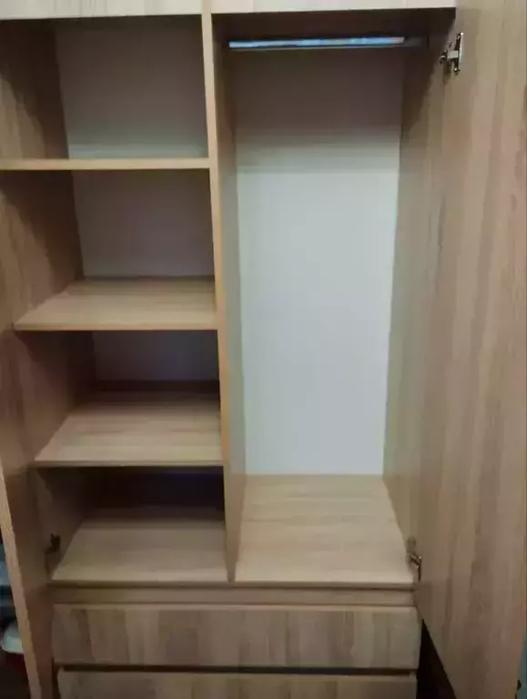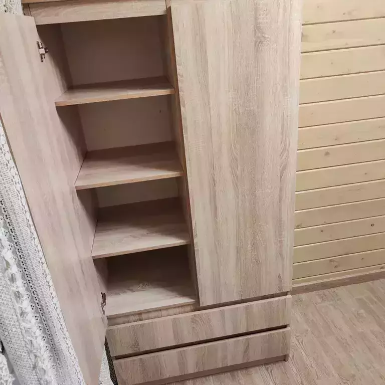 Оборудован двумя распашными дверями сверху и двумя выдвижными ящиками снизу. За дверями расположены два отделения с одной стороны с горизонтальной штангой (420 мм) для одежды на плечиках, с другой с тремя полками. Продуманная конструкция позволяет убрать лишние предметы, тем самым сохраняя единый стиль оформления помещения. Отсутствие ручек главное преимущество данной модели. Роль ручек выполняют сами фасады. Открывание ящиков и дверей производится за счет пространства между планками и фасадами. Выдвижные ящики на роликовых направляющих L=400 мм. неполного выдвижения обеспечивают комфортную эксплуатацию.